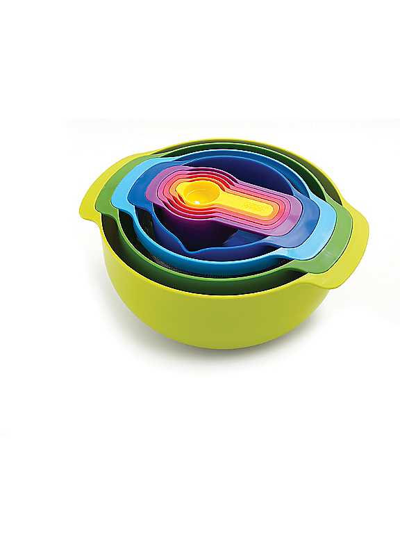 We've all experienced opening a cupboard door in the kitchen and having everything inside come tumbling out. We designed NestTM, 9 Plus to remedy this. Our colourful food-prep set includes five measuring cups, two mixing bowls, a colander and a sieve that nest together when not in use, saving valuable space in the cupboard and making food prep more efficient and enjoyable.Set includes: 4.5L mixing bowl, 3L colander, 1.65L sieve, 0.5L mixing bowl and 5 measuring cupsSpace-saving design allows individual elements to stack neatly togetherLarge mixing bowl has a non-slip base and wide carry handlesSmall mixing bowl includes measurements inside (ml / fl.oz) and a pouring spout0.5L mixing bowl includes metric and imperial measurements inside for added convenience (ml / fl.oz)Includes a stainless-steel mesh sieve and large colanderDimensions approx. 14.5H x 28.5W x 28.5D cm