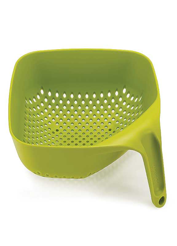 This ergonomic colander has several unique features. The single vertical handle leaves one hand free for operating the tap and ensures it remains upright and stable if placed in a sink. Its square corners make emptying food easier and the vertical holes allow liquids to drain away quickly. Along with its square shape, this latest version is now stackable making it even more space efficient. Dishwasher safe. BPA Free.Dishwasher safe, PP