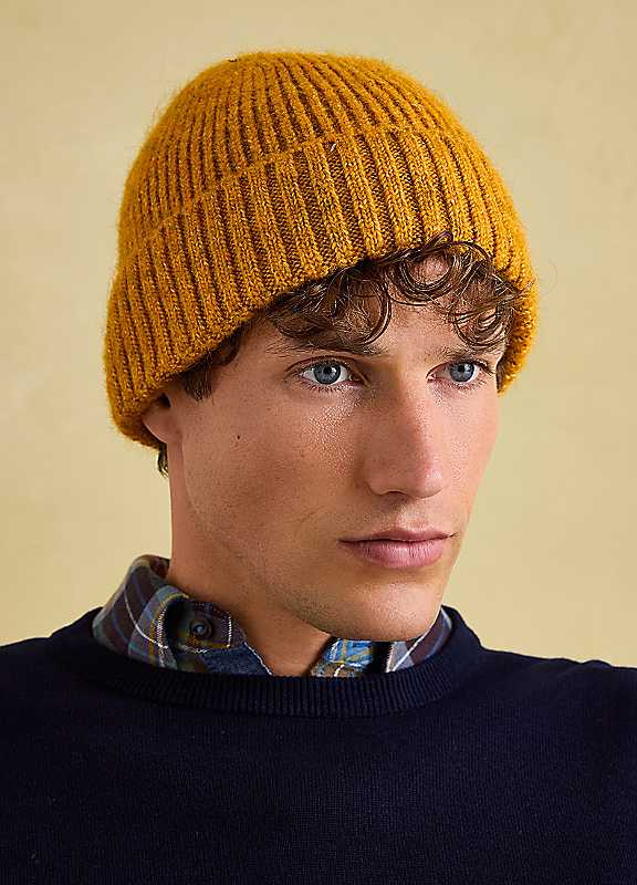 The Berwick yellow beanie is designed for the cold weather. It's made from soft ribbed fabric and comes in a line-up of colours. Its un-fussy design makes it truly timeless and ensures it remains part of your cold-weather attire for a long time to come. Finished with a turnback cuff, Joules branded tab and a matching pair of Berwick gloves available separately. Machine washable Re-shape whilst damp Do not iron 55% Acrylic, 33% Polyester, 10% Nylon, 2% Elastane | polyester beanie, nylon beanie, warm beanie, polyester hat, soft beanie
