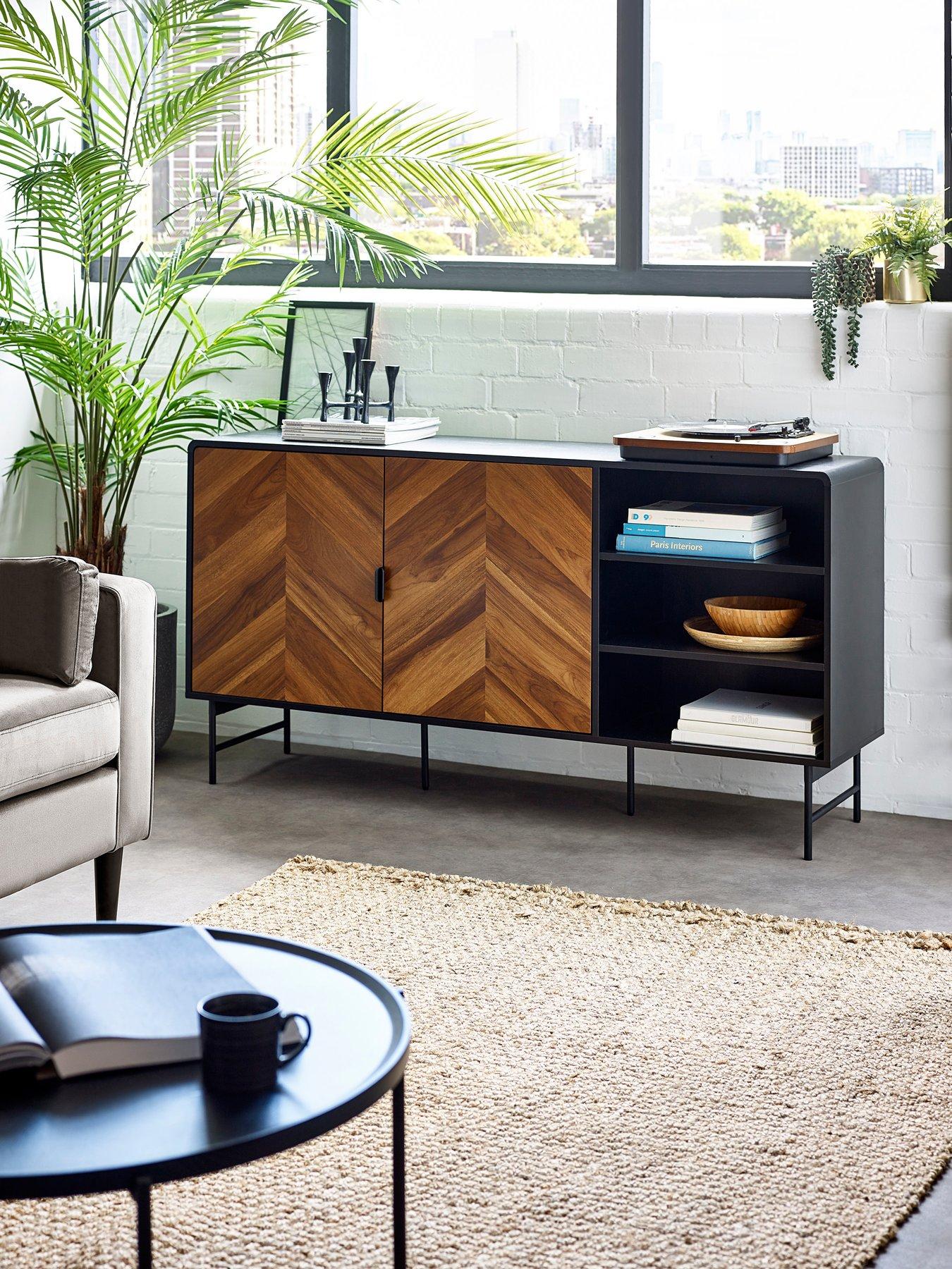 Julian Bowen Alvin Black And Natural Wood-effect Sideboard Make a statement with this striking sideboard, adding both style and smart storage to your space. The bold chevron warm wood-effect doors are framed by smooth curved edges and finished with sleek black edge handles for a refined look. Two open shelves offer easy access to display or store items, while the two doors open to reveal large shelves inside, providing generous hidden storage in this versatile cabinet. Supported by slim black metal legs, the piece feels light and airy, making it a perfect addition to living rooms, dining areas, or hallways. Self-assembly required. Assembly: Self Assembly Depth: 40 CM Height: 82 CM Material Content: MDF board with melamine&black paper,metal tube in matt black rough powder coating Width: 160 CM Finish Type: Painted Number of Doors: 2 door Number of Shelves: 4 Adjustable: N Eye-catching chevron natural wood-effect doors. Smooth curved edges with sleek black handles. Generous shelving space for display or storage. H 82 x W 160 x D 40cm; 40.5kg. Assembly required Number of Internal Shelves: 4 Shelf Type: Fixed Adjustable Shelf: N Removable Shelves: N Pre-Drilled Holes: Y