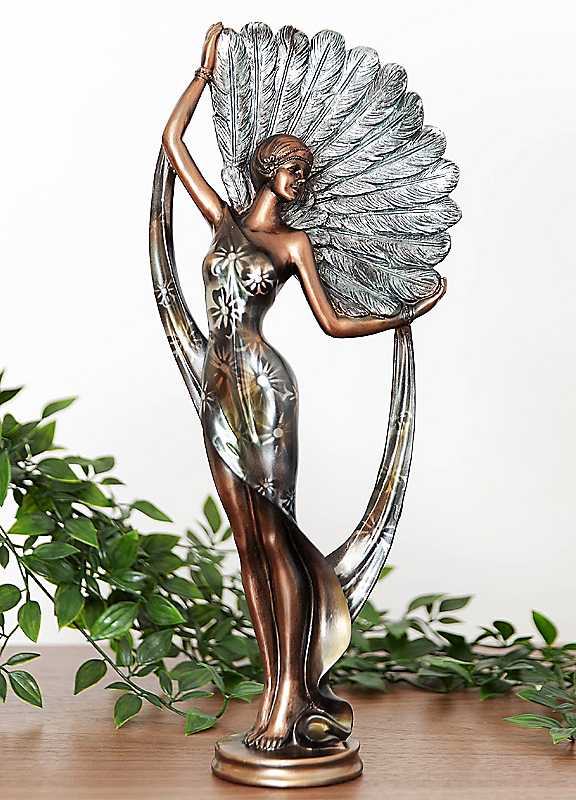 A beautifully intricate bronze-style dancing resin lady figurine. From the Silhouette collection by Juliana - contemporary and classic figurines for the discerning modern collector.This elegant lady wears a long metallic silver gown with a floral pattern. She holds a large peacock-style feather fan behind her head. She stands on a plinth.The figurine is cast from hard-wearing resin using a handmade clay mould. The perfect gift for any collector, complete with a branded gift box.Brand: Juliana100% PolyresinDimensions approx. 37 x 7.5 x 15.5 cm