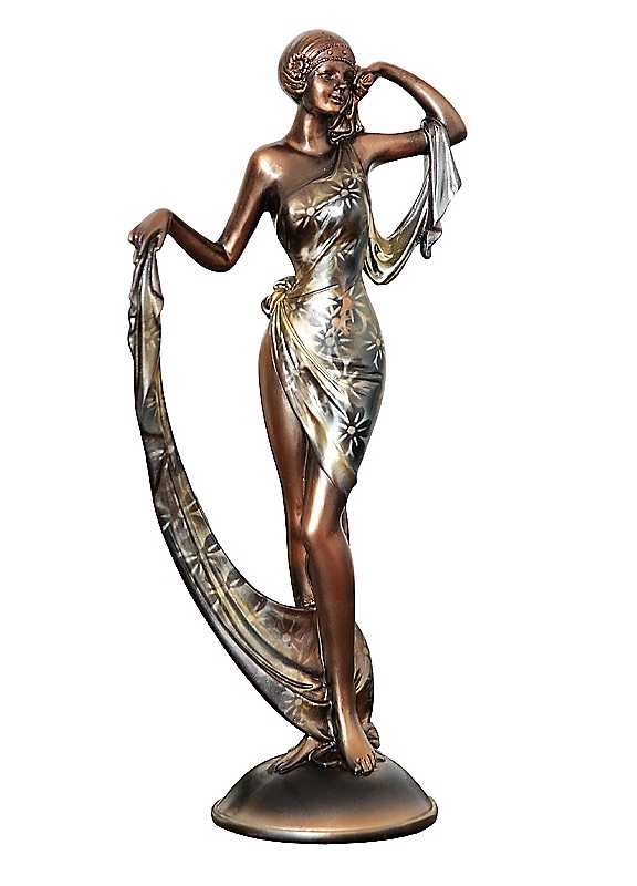 A beautifully intricate bronze-style dancing resin lady figurine. From the Silhouette collection by Juliana - contemporary and classic figurines for the discerning modern collector.This elegant lady wears a long metallic silver gown with a floral pattern. She holds the train of her dress in one hand and the other is raised to her head. She stands on a plinth.The figurine is cast from hard-wearing resin using a handmade clay mould.Brand: Juliana100% PolyresinDimensions approx. 31 x 8.5 x 14.5 cm