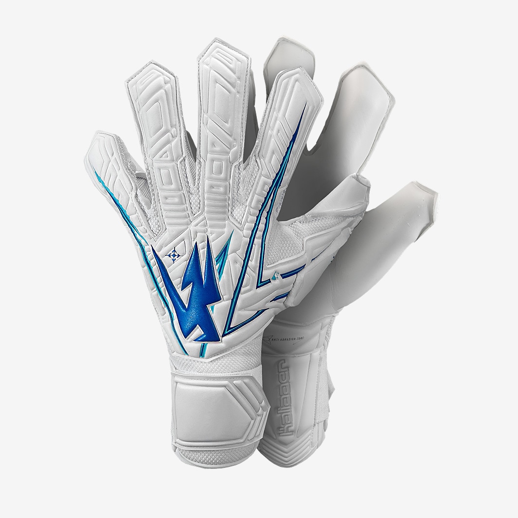 Play to your maximum wearing Kaliaaer Kids Xtension Latex goalkeeper gloves in WhiteBlue. Designed for exceptional hand to ball coverage, the Kaliaaer Xtension puts you in position to claim the ball with total confidence. The Xtension cut encourages your hands to wrap around the ball, giving greater control and improving your handling. The gloves HiDri body aids ventilation to keep your hands fresh and comfortable, while the palm is allweather Profi Grade latex for supreme grip and durability in any conditions.On the backhand, allover latex reinforcement provides cushioning for big punches.At the wrist, the LockON SPEED SYSTEM combines an extended glove body with a strap closure for easy entry and adjustment. Latex backhand HiDri body PRECHARGED palm latex Ready to go straight from the start Allweather Performs well in wet and dry conditions Profi Grade latex Providing supreme grip and durability LockON SPEED SYSTEM Developed for exceptional wrist support and comfort. The body of the glove extends down to the wrist area XT Xtension CUT Provides extra reach, extra margin for that gamechanging save. Tested by elite pro keepers, the engineered fit sets hands in a catchready position with exceptional hand to ball coverage