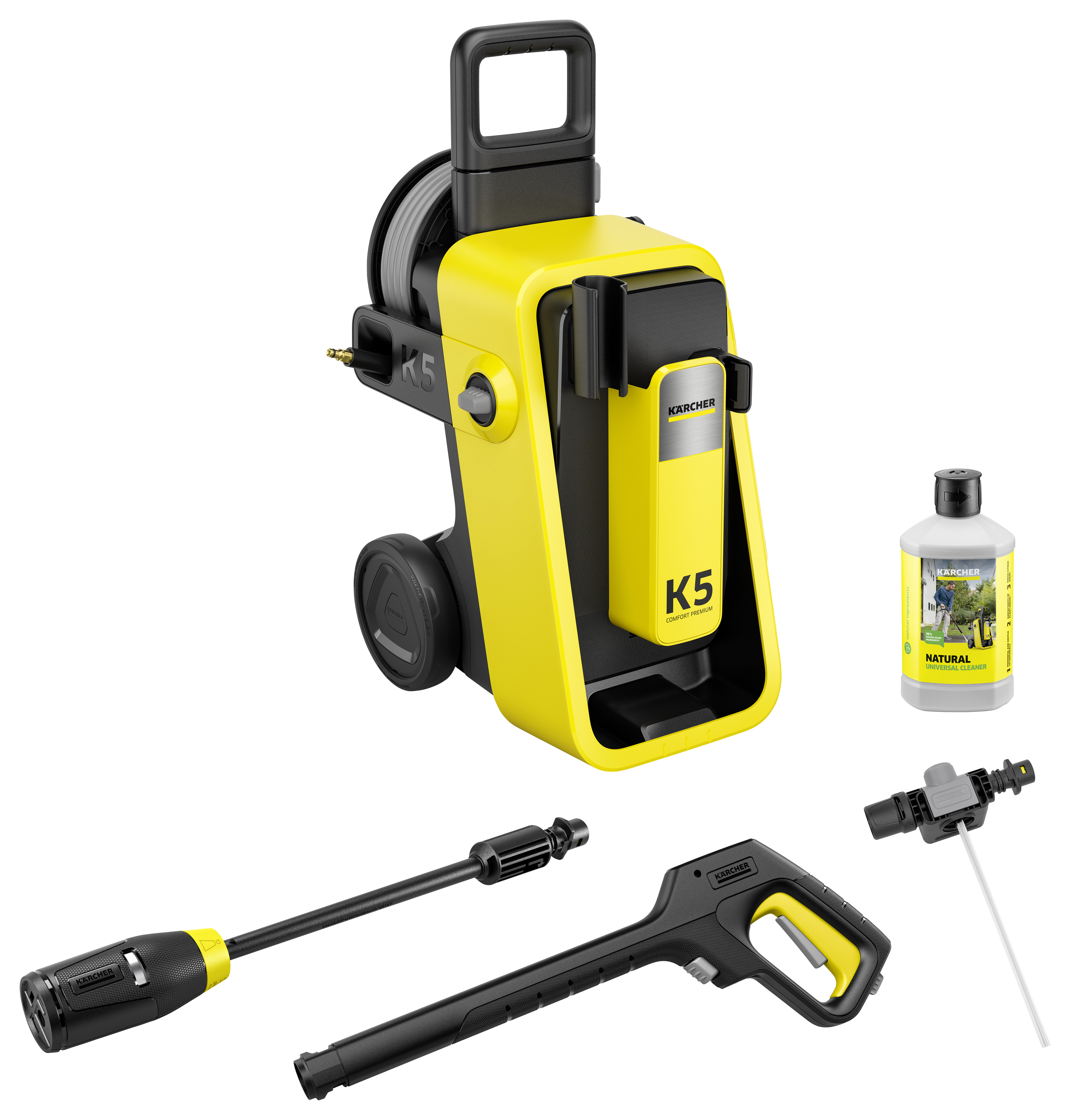 Karcher K5 Comfort Premium Pressure Washer - Karcher K5 Comfort Premium Pressure Washer delivers 145 bars of pressure and 500L/h water flow to make light work of the toughest cleaning jobs, from shifting mud from delicate car paintwork to removing stubborn patio grime. It is equipped with an integrated hose reel with a 10m premium high-pressure flexible hose for easy unwinding and a Comfort!Hold trigger gun for use with the versatile 4-in-1 Multi Jet lance. The kit also includes a 1L bottle of Natural Universal Cleaner to help break down dirt and grime. The machine is made from 25% recycled material and features on-board storage for cables and accessories. This pressure washer comes with a standard two-year guarantee, with an option to extend to five years by registering your product at karcher.com/register within 28 days of purchase (T&Cs apply).
