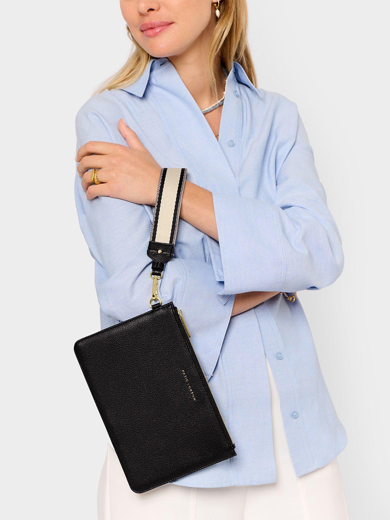 Katie Loxton Hallie Wristlet Pouch In Black The Hallie Wristlet Pouch from Katie Loxton features a secure top zip closure, making it perfect for holding your small essentials and phone while keeping them easily accessible on your wrist. This versatile pouch includes two detachable wristlet straps, one in smooth pebble vegan leather and another in chic canvas, allowing you to effortlessly switch up your outfits. Material Content: PU