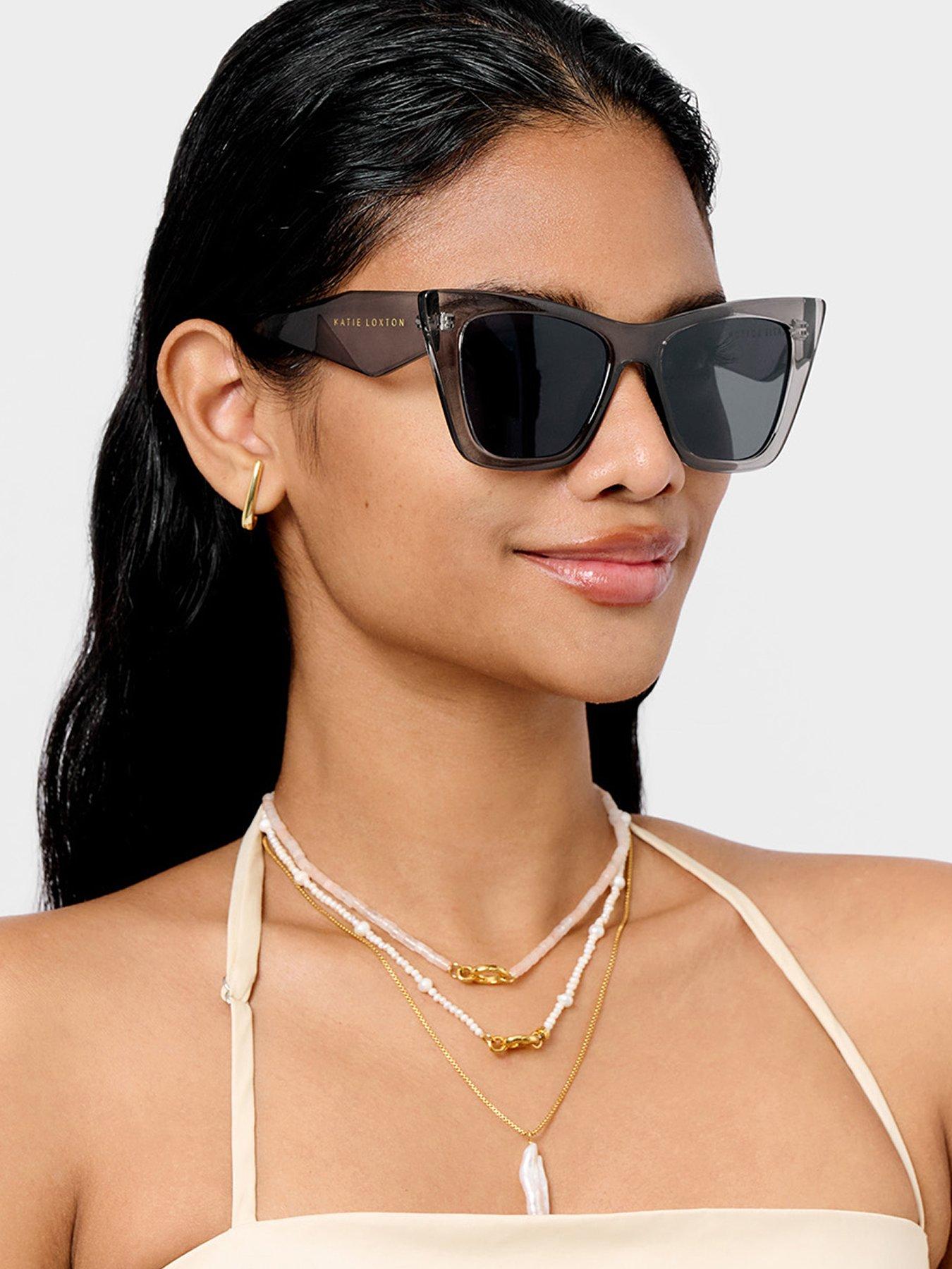 Katie Loxton Porto Sunglasses - Grey Transparent The Porto Sunglasses from Katie Loxtonfeatures UV400 protection which cuts out 99% of UVA and UVB rays. Designed to be worn all year-round, these sunglasses come complete with a protective fold-down sunglasses case that will keep them safe and scratch-free while in your handbag. Material Content: PC Frame, PC Temples, Polycarbonate Lens