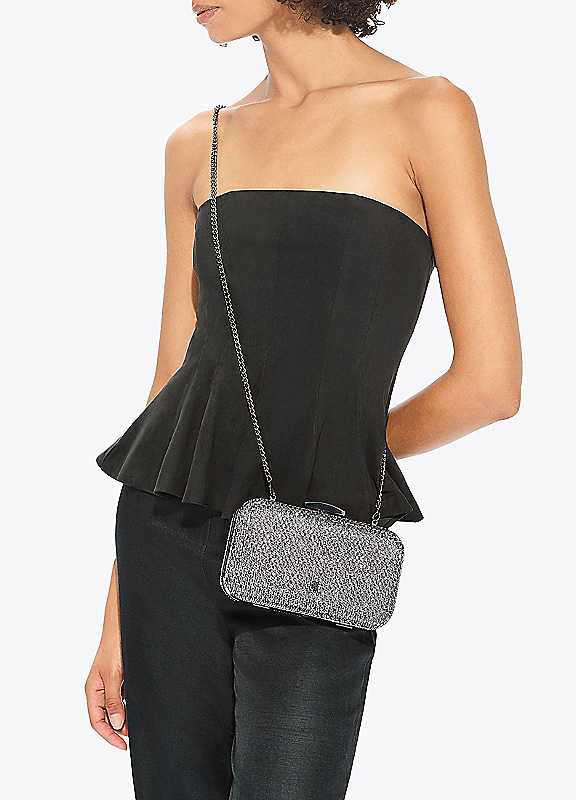 This carvela fleur box clutch bag is crafted from a pewter fabric that is embellished with crystals. There is a gunmetal tone pin stud on the back of the bag complimenting the clasp closure.FabricSize approx. 10H x 19L x 4D cmStrap length: 124 cm