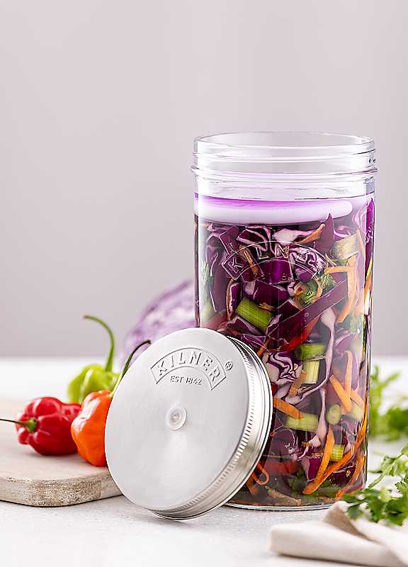 The 1 Litre Kilner® Fermentation Jar Set provides an easy way to create smaller batches of your own delicious, fermented foods packed with vitamins, minerals and probiotic cultures.The wide neck opening on the jar allows for easy filling and decanting of the finished creation. The unique silicone duck beak-shaped valve incorporated in the lid releases the gases that build up inside the jar during the fermentation process. However, the atmospheric air on the outside will not be able to enter the jar, which usually causes food to spoil.The ceramic weights sit on top of the ingredients to ensure that they are kept under the brine solution. Once fermentation is complete, the one-piece lid allows you to store the finished food in the fridge ready to consume.Packaged in a full colour gift box with recipe and instruction booklet, ideal for gifting.The jar is suitable for the dishwasher.Lids need to be hand washed and dried immediately.Set Contains:1 x Kilner® Wide Mouth Jar2 x Kilner® Ceramic Weights1 x Stainless Steel Lid with Silicone Valves1 x Recipe BookletORIGINAL & THE BEST -The glass jar is made from high-quality soda lime glass material with pristine clarity and consistent wall thickness ensuring no weak points.GLASS IS BEST & SUSTAINABLE -Glass is best for storing/preserving and transporting food and drink. It is made from natural ingredients so no harmful chemicals or toxins can leak into the food. Glass is BPA free and does not absorb odours, flavours or stains. Not only is glass a healthier option, it is made to last and never for single use. Kilner® continues to tackle plastic waste with our ethos of REUSE, REFILL, RECYCLE.THE KILNER® STORY -The original Kilner® Jar, invented by John Kilner and Co. in England is as much loved and successful now as it was over 180 years ago.Our diverse product range provides simple solutions for preserving, food preparation, storage and eating on-the-go using high-quality materials all authenticated with the iconic Kilner® brand logo.Dishwasher safeDishwasher Safe, Do not pour boiling water directly into your jars/bottles, Wash before first use, Handwash air lock, Always use filtered water