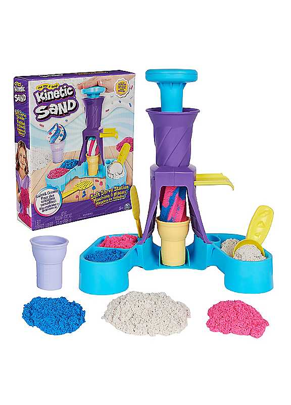 Swirl and create with the Kinetic Sand Soft Serve Station. For the first time, kids can swirl Kinetic Sand to mimic a soft-serve ice-cream experience like they've seen in the real world. With 396g of blue, pink and white Kinetic Sand, two ice-cream cones, and tools like a sprinkle grater and a scoop with sweet treat moulds, your child can serve up endless ice-cream possibilities. Scoop classic cones or create the ultimate swirl. Flow sand into the station, push down to swirl Kinetic Sand into the cone and remove to decorate. Add some sprinkles and extra toppings, then squish and create all over again. The One and Only Kinetic Sand is made from natural sand that sticks to itself for easy clean-up. It never dries out. Let it flow through your hands - it's so satisfying, you won't be able to put it down. Kinetic Sand is an exciting alternative to arts and crafts modelling clay and is a welcome addition to the craft table, sensory bin, kids' activities time and Montessori toys. Kinetic Sand promotes fine motor skills and creativity through independent tactile play. Bring the ice-cream fun home with the Kinetic Sand Soft Serve Station.Brand: Kinetic5 Years +