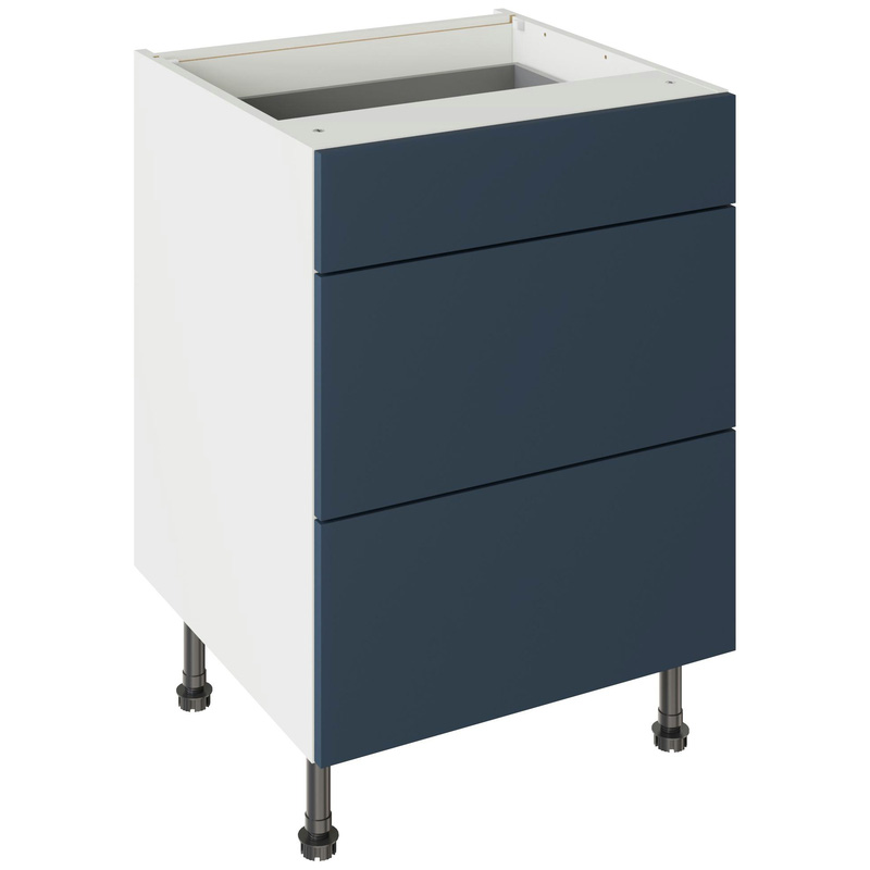 Assembling your kitchen cabinet has never been so easy. With this Kitchen Kit flatpack unit, you won't need to follow pages and pages of complicated instructions. Cabinets can be put together in lightning quick time with our cam and dowel quick-build design. The soft-close drawer runners ensure a smooth and silent action, adding a touch of luxury to your kitchen. Four adjustable legs make it easy to achieve maximum stability for base units, while a 49 mm service void allows you plenty of space for concealing pipes or wiring. Personalise your kitchen by choosing from a wide range of colours, sizes, and door styles. Whether you prefer the handleless J-Pull, the classic Shaker, or the modern Slab design, you can create a look you’ll love. * Delivered flat-packed with cabinet, door and hinges included * Cam and Dowel Quick-build design * Simply glue and click together to form a strong fixing - fast! * Soft Close Hafele drawer boxes. * Fully integrated soft-close hinges - no more doors slamming shut * 150 mm adjustable legs to ensure maximum stability * 49 mm rear service void for concealing pipes, wiring and other essentials * 18 mm MFC cabinet with 8 mm back for rigidity * FIRA Gold certification on doors and cabinets * Door handles, plinths, panels and other accessories sold separately | Kitchen Kit 3 Drawer Base Kitchen Cabinet Flatpack Slab Supermatt 600mm in Blue