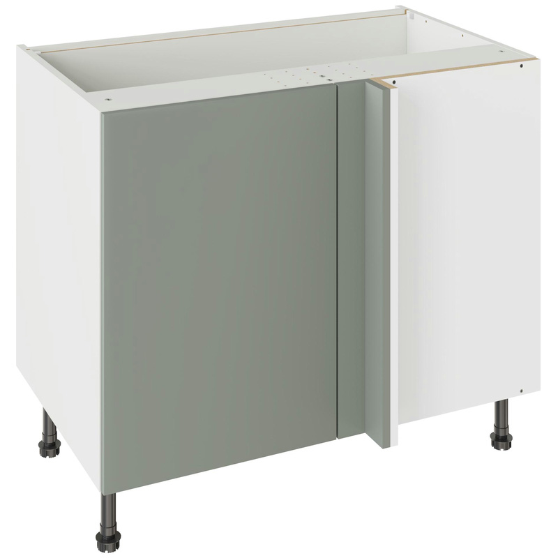 Assembling your kitchen cabinet has never been so easy. With this Kitchen Kit flatpack unit, you won't need to follow pages and pages of complicated instructions. Cabinets can be put together in lightning quick time with our cam and dowel quick-build design. Doors can be hinged on the left or right side of this kitchen unit to best suit your layout, with a soft-close function that ensures they'll never slam shut loudly again. Four adjustable legs make it easy to achieve maximum stability for base units, while a 49 mm service void allows you plenty of space for concealing pipes or wiring. Personalise your kitchen by choosing from a wide range of colours, sizes, and door styles. Whether you prefer the handleless J-Pull, the classic Shaker, or the modern Slab design, you can create a look you’ll love. * Delivered flat-packed with cabinet, door and hinges included * Cam and Dowel Quick-build design * Simply glue and click together to form a strong fixing - fast! * Doors can be hinged on the left or right side to suit your configuration * Fully integrated soft-close hinges - no more doors slamming shut * 150 mm adjustable legs to ensure maximum stability * 49 mm rear service void for concealing pipes, wiring and other essentials * 18 mm MFC cabinet with 8 mm back for rigidity * 18mm Door drilled ready to hang * FIRA Gold certification on doors and cabinets * Door handles, plinths, panels and other accessories sold separately | Kitchen Kit Blind Corner Base Kitchen Cabinet Flatpack Slab Supermatt 1000mm in Agave Green