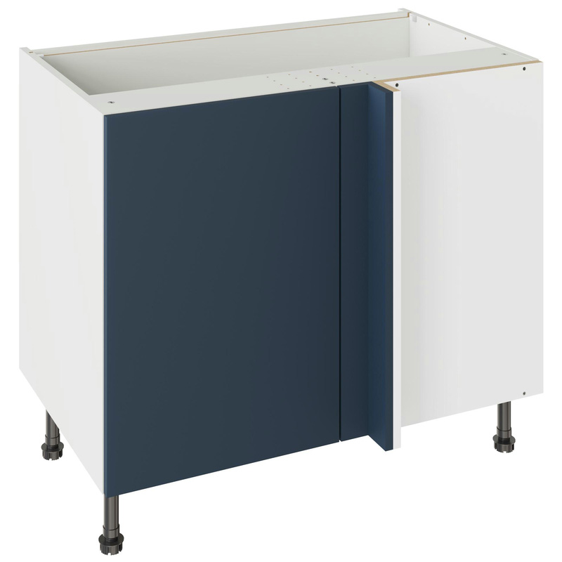 Assembling your kitchen cabinet has never been so easy. With this Kitchen Kit flatpack unit, you won't need to follow pages and pages of complicated instructions. Cabinets can be put together in lightning quick time with our cam and dowel quick-build design. Doors can be hinged on the left or right side of this kitchen unit to best suit your layout, with a soft-close function that ensures they'll never slam shut loudly again. Four adjustable legs make it easy to achieve maximum stability for base units, while a 49 mm service void allows you plenty of space for concealing pipes or wiring. Personalise your kitchen by choosing from a wide range of colours, sizes, and door styles. Whether you prefer the handleless J-Pull, the classic Shaker, or the modern Slab design, you can create a look you’ll love. * Delivered flat-packed with cabinet, door and hinges included * Cam and Dowel Quick-build design * Simply glue and click together to form a strong fixing - fast! * Doors can be hinged on the left or right side to suit your configuration * Fully integrated soft-close hinges - no more doors slamming shut * 150 mm adjustable legs to ensure maximum stability * 49 mm rear service void for concealing pipes, wiring and other essentials * 18 mm MFC cabinet with 8 mm back for rigidity * 18mm Door drilled ready to hang * FIRA Gold certification on doors and cabinets * Door handles, plinths, panels and other accessories sold separately | Kitchen Kit Blind Corner Base Kitchen Cabinet Flatpack Slab Supermatt 1000mm in Blue
