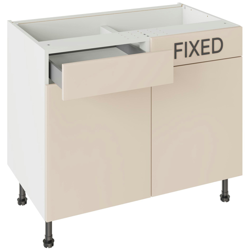Assembling your kitchen cabinet has never been so easy. With this Kitchen Kit flatpack unit, you won't need to follow pages and pages of complicated instructions. Cabinets can be put together in lightning quick time with our cam and dowel quick-build design. The soft-close drawer runners ensure a smooth and silent action, adding a touch of luxury to your kitchen. Four adjustable legs make it easy to achieve maximum stability for base units, while a 49 mm service void allows you plenty of space for concealing pipes or wiring. Personalise your kitchen by choosing from a wide range of colours, sizes, and door styles. Whether you prefer the handleless J-Pull, the classic Shaker, or the modern Slab design, you can create a look you’ll love. * Delivered flat-packed with cabinet, door and hinges included * Cam and Dowel Quick-build design * Simply glue and click together to form a strong fixing - fast! * Soft Close Hafele drawer boxes. * Fully integrated soft-close hinges - no more doors slamming shut * 150 mm adjustable legs to ensure maximum stability * 49 mm rear service void for concealing pipes, wiring and other essentials * 18 mm MFC cabinet with 8 mm back for rigidity * FIRA Gold certification on doors and cabinets * Door handles, plinths, panels and other accessories sold separately | Kitchen Kit Drawerline Base Cabinet Flatpack Slab Supergloss 1000mm in Cashmere