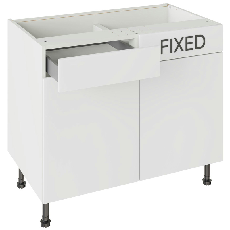 Assembling your kitchen cabinet has never been so easy. With this Kitchen Kit flatpack unit, you won't need to follow pages and pages of complicated instructions. Cabinets can be put together in lightning quick time with our cam and dowel quick-build design. The soft-close drawer runners ensure a smooth and silent action, adding a touch of luxury to your kitchen. Four adjustable legs make it easy to achieve maximum stability for base units, while a 49 mm service void allows you plenty of space for concealing pipes or wiring. Personalise your kitchen by choosing from a wide range of colours, sizes, and door styles. Whether you prefer the handleless J-Pull, the classic Shaker, or the modern Slab design, you can create a look you’ll love. * Delivered flat-packed with cabinet, door and hinges included * Cam and Dowel Quick-build design * Simply glue and click together to form a strong fixing - fast! * Soft Close Hafele drawer boxes. * Fully integrated soft-close hinges - no more doors slamming shut * 150 mm adjustable legs to ensure maximum stability * 49 mm rear service void for concealing pipes, wiring and other essentials * 18 mm MFC cabinet with 8 mm back for rigidity * FIRA Gold certification on doors and cabinets * Door handles, plinths, panels and other accessories sold separately | Kitchen Kit Drawerline Base Cabinet Flatpack Value Slab Matt White 1000mm in Snow White