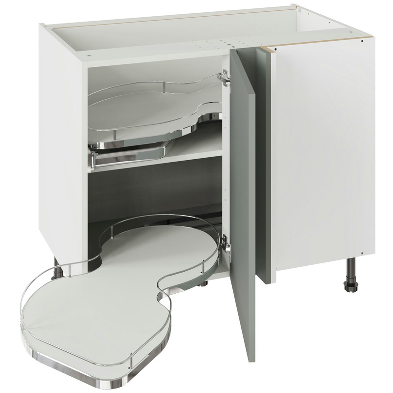 Ensure your two rows of kitchen cabinets are joined together perfectly with this blind corner base unit from Kitchen Kit. Like the rest of the range, the unit is delivered flat-packed and assembly is a breeze. Simply glue and click it together to form a strong and reliable fixing - these cabinets can be put together in as little as 30 seconds. The blind corner base cabinet includes a right-hand door with pull-out shelves to help you maximise storage space and make it easier to access items kept inside. The door has a soft-close mechanism too - no more doors slamming shut! Four adjustable legs ensure maximum stability, and a 49mm service void provides ample space for concealing pipes or wiring. The Kitchen Kit Shaker collection adds contemporary class to any layout. With their bevelled internal profile, Shaker doors feature a two-piece construction - a 15mm MDF base panel and 4mm framing, pressed together with a durable foil for long-lasting strength and style. Drawer fronts have an 18mm slab construction, creating a kitchen that looks every bit as good as it's built. * Delivered flat-packed with cabinet, door and hinges included * Quick-build design - assemble your cabinets in as little as 30 seconds * Simply glue and click together to form a strong fixing - fast! * Pull-out shelves for tidy storage and easier access * Wirework included, but does not come fitted * Fully integrated soft-close hinges - no more doors slamming shut * 150mm adjustable legs to ensure maximum stability * 49mm rear service void for concealing pipes, wiring and other essentials * 18mm MFC cabinet with 8mm back for rigidity * Two-piece door construction with 15mm MDF base panel and 4mm framing * Door's base panel and framing pressed together with durable foil * FIRA Gold certification on doors and cabinets * Door handles, plinths, panels and other accessories sold separately Assembling your kitchen cabinet has never been so easy. With this Kitchen Kit flatpack unit, you won't need to follow pages and pages of complicated instructions. Cabinets can be put together in lightning quick time with our cam and dowel quick-build design. Doors can be hinged on the left or right side of this kitchen unit to best suit your layout, with a soft-close function that ensures they'll never slam shut loudly again. Four adjustable legs make it easy to achieve maximum stability for base units, while a 49 mm service void allows you plenty of space for concealing pipes or wiring. Personalise your kitchen by choosing from a wide range of colours, sizes, and door styles. Whether you prefer the handleless J-Pull, the classic Shaker, or the modern Slab design, you can create a look you’ll love. * Delivered flat-packed with cabinet, door and hinges included * Cam and Dowel Quick-build design * Simply glue and click together to form a strong fixing - fast! * Doors can be hinged on the left or right side to suit your configuration * Fully integrated soft-close hinges - no more doors slamming shut * 150 mm adjustable legs to ensure maximum stability * 49 mm rear service void for concealing pipes, wiring and other essentials * 18 mm MFC cabinet with 8 mm back for rigidity * 18mm Door drilled ready to hang * FIRA Gold certification on doors and cabinets * Door handles, plinths, panels and other accessories sold separately | Kitchen Kit Flatpack Shaker Kitchen Cabinet Pull-Out Base Blind Corner Unit Matt Sage 1000mm in Green