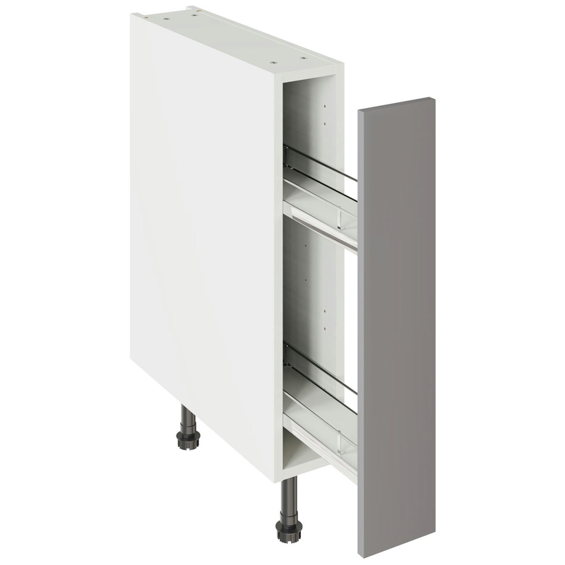 Assembling your kitchen cabinet has never been so easy. With this Kitchen Kit flatpack unit, you won't need to follow pages and pages of complicated instructions. Cabinets can be put together in lightning quick time with our cam and dowel quick-build design. Doors can be hinged on the left or right side of this kitchen unit to best suit your layout, with a soft-close function that ensures they'll never slam shut loudly again. Four adjustable legs make it easy to achieve maximum stability for base units, while a 49 mm service void allows you plenty of space for concealing pipes or wiring. Personalise your kitchen by choosing from a wide range of colours, sizes, and door styles. Whether you prefer the handleless J-Pull, the classic Shaker, or the modern Slab design, you can create a look you’ll love. * Delivered flat-packed with cabinet, door and hinges included * Cam and Dowel Quick-build design * Simply glue and click together to form a strong fixing - fast! * Doors can be hinged on the left or right side to suit your configuration * Fully integrated soft-close hinges - no more doors slamming shut * 150 mm adjustable legs to ensure maximum stability * 49 mm rear service void for concealing pipes, wiring and other essentials * 18 mm MFC cabinet with 8 mm back for rigidity * 18mm Door drilled ready to hang * FIRA Gold certification on doors and cabinets * Door handles, plinths, panels and other accessories sold separately | Kitchen Kit Flatpack Shaker Kitchen Cabinet Pull Out Base Unit Ultra Matt 150mm in Dust Grey | MFC