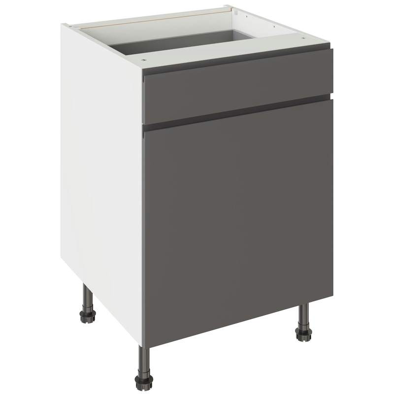 Assembling your kitchen cabinet has never been so easy. With this Kitchen Kit flatpack unit, you won't need to follow pages and pages of complicated instructions. Cabinets can be put together in lightning quick time with our cam and dowel quick-build design. The soft-close drawer runners ensure a smooth and silent action, adding a touch of luxury to your kitchen. Four adjustable legs make it easy to achieve maximum stability for base units, while a 49 mm service void allows you plenty of space for concealing pipes or wiring. Personalise your kitchen by choosing from a wide range of colours, sizes, and door styles. Whether you prefer the handleless J-Pull, the classic Shaker, or the modern Slab design, you can create a look you’ll love. * Delivered flat-packed with cabinet, door and hinges included * Cam and Dowel Quick-build design * Simply glue and click together to form a strong fixing - fast! * Soft Close Hafele drawer boxes. * Fully integrated soft-close hinges - no more doors slamming shut * 150 mm adjustable legs to ensure maximum stability * 49 mm rear service void for concealing pipes, wiring and other essentials * 18 mm MFC cabinet with 8 mm back for rigidity * FIRA Gold certification on doors and cabinets * Door handles, plinths, panels and other accessories sold separately | Kitchen Kit J-Pull Drawerline Base Cabinet Flatpack Gloss 600mm in Graphite