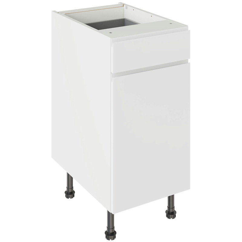 Assembling your kitchen cabinet has never been so easy. With this Kitchen Kit flatpack unit, you won't need to follow pages and pages of complicated instructions. Cabinets can be put together in lightning quick time with our cam and dowel quick-build design. The soft-close drawer runners ensure a smooth and silent action, adding a touch of luxury to your kitchen. Four adjustable legs make it easy to achieve maximum stability for base units, while a 49 mm service void allows you plenty of space for concealing pipes or wiring. Personalise your kitchen by choosing from a wide range of colours, sizes, and door styles. Whether you prefer the handleless J-Pull, the classic Shaker, or the modern Slab design, you can create a look you’ll love. * Delivered flat-packed with cabinet, door and hinges included * Cam and Dowel Quick-build design * Simply glue and click together to form a strong fixing - fast! * Soft Close Hafele drawer boxes. * Fully integrated soft-close hinges - no more doors slamming shut * 150 mm adjustable legs to ensure maximum stability * 49 mm rear service void for concealing pipes, wiring and other essentials * 18 mm MFC cabinet with 8 mm back for rigidity * FIRA Gold certification on doors and cabinets * Door handles, plinths, panels and other accessories sold separately | Kitchen Kit J-Pull Drawerline Base Cabinet Flatpack Matt 400mm in White