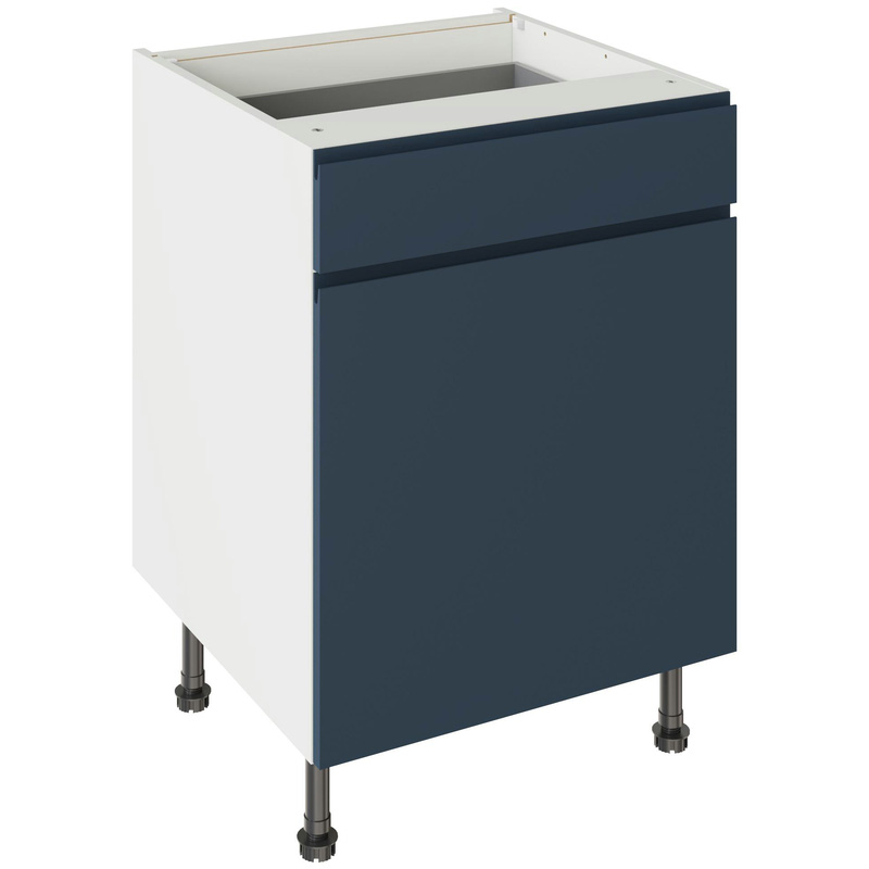 Assembling your kitchen cabinet has never been so easy. With this Kitchen Kit flatpack unit, you won't need to follow pages and pages of complicated instructions. Cabinets can be put together in lightning quick time with our cam and dowel quick-build design. The soft-close drawer runners ensure a smooth and silent action, adding a touch of luxury to your kitchen. Four adjustable legs make it easy to achieve maximum stability for base units, while a 49 mm service void allows you plenty of space for concealing pipes or wiring. Personalise your kitchen by choosing from a wide range of colours, sizes, and door styles. Whether you prefer the handleless J-Pull, the classic Shaker, or the modern Slab design, you can create a look you’ll love. * Delivered flat-packed with cabinet, door and hinges included * Cam and Dowel Quick-build design * Simply glue and click together to form a strong fixing - fast! * Soft Close Hafele drawer boxes. * Fully integrated soft-close hinges - no more doors slamming shut * 150 mm adjustable legs to ensure maximum stability * 49 mm rear service void for concealing pipes, wiring and other essentials * 18 mm MFC cabinet with 8 mm back for rigidity * FIRA Gold certification on doors and cabinets * Door handles, plinths, panels and other accessories sold separately | Kitchen Kit J-Pull Drawerline Base Cabinet Flatpack Matt 600mm in Indigo Blue