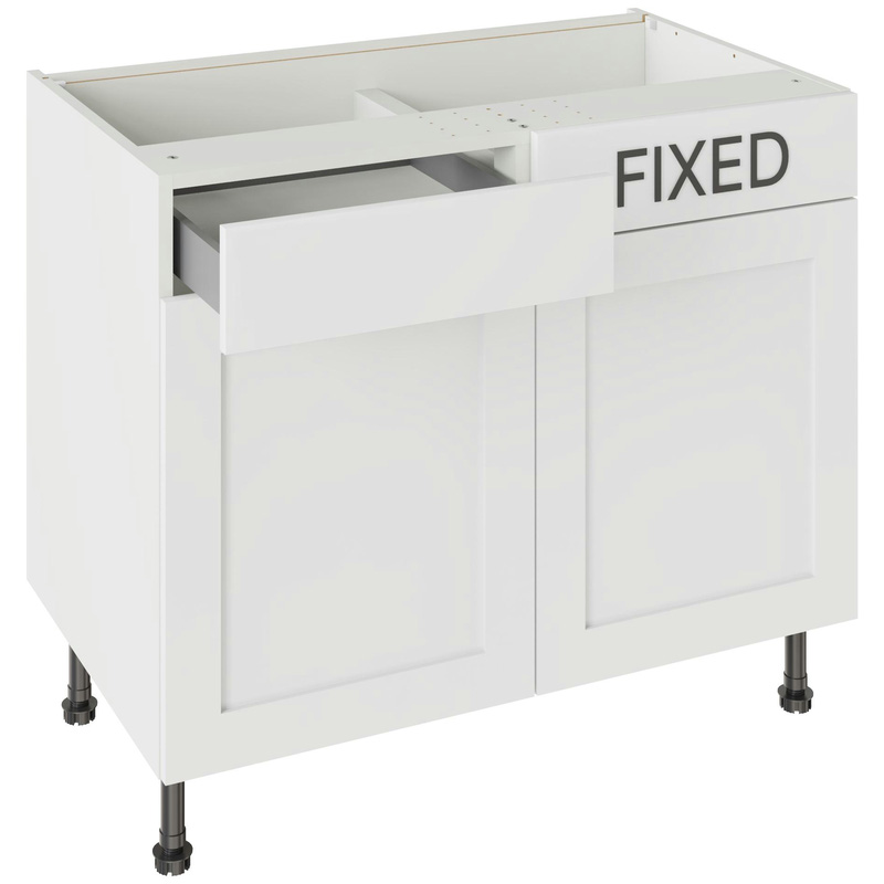 Assembling your kitchen cabinet has never been so easy. With this Kitchen Kit flatpack unit, you won't need to follow pages and pages of complicated instructions. Cabinets can be put together in lightning quick time with our cam and dowel quick-build design. The soft-close drawer runners ensure a smooth and silent action, adding a touch of luxury to your kitchen. Four adjustable legs make it easy to achieve maximum stability for base units, while a 49 mm service void allows you plenty of space for concealing pipes or wiring. Personalise your kitchen by choosing from a wide range of colours, sizes, and door styles. Whether you prefer the handleless J-Pull, the classic Shaker, or the modern Slab design, you can create a look you’ll love. * Delivered flat-packed with cabinet, door and hinges included * Cam and Dowel Quick-build design * Simply glue and click together to form a strong fixing - fast! * Soft Close Hafele drawer boxes. * Fully integrated soft-close hinges - no more doors slamming shut * 150 mm adjustable legs to ensure maximum stability * 49 mm rear service void for concealing pipes, wiring and other essentials * 18 mm MFC cabinet with 8 mm back for rigidity * FIRA Gold certification on doors and cabinets * Door handles, plinths, panels and other accessories sold separately | Kitchen Kit Shaker Drawerline Base Cabinet Flatpack Matt 1000mm in White