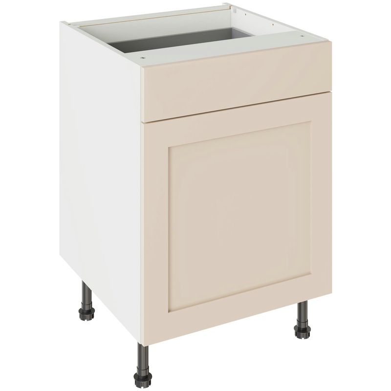 Assembling your kitchen cabinet has never been so easy. With this Kitchen Kit flatpack unit, you won't need to follow pages and pages of complicated instructions. Cabinets can be put together in lightning quick time with our cam and dowel quick-build design. The soft-close drawer runners ensure a smooth and silent action, adding a touch of luxury to your kitchen. Four adjustable legs make it easy to achieve maximum stability for base units, while a 49 mm service void allows you plenty of space for concealing pipes or wiring. Personalise your kitchen by choosing from a wide range of colours, sizes, and door styles. Whether you prefer the handleless J-Pull, the classic Shaker, or the modern Slab design, you can create a look you’ll love. * Delivered flat-packed with cabinet, door and hinges included * Cam and Dowel Quick-build design * Simply glue and click together to form a strong fixing - fast! * Soft Close Hafele drawer boxes. * Fully integrated soft-close hinges - no more doors slamming shut * 150 mm adjustable legs to ensure maximum stability * 49 mm rear service void for concealing pipes, wiring and other essentials * 18 mm MFC cabinet with 8 mm back for rigidity * FIRA Gold certification on doors and cabinets * Door handles, plinths, panels and other accessories sold separately | Kitchen Kit Shaker Drawerline Base Cabinet Flatpack Matt 600mm in Cashmere