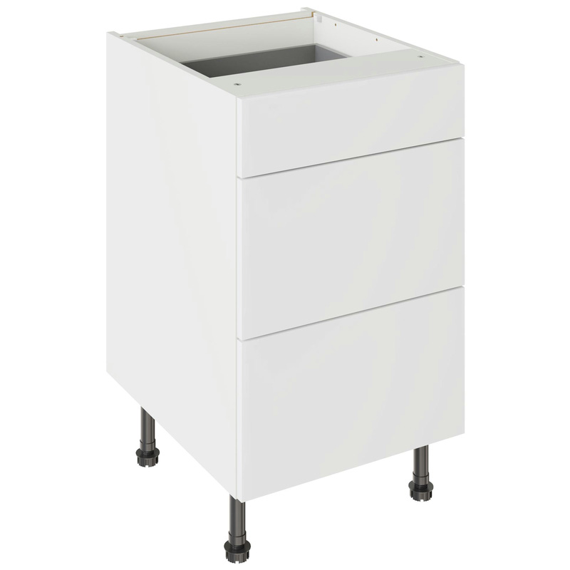 Assembling your kitchen cabinet has never been so easy. With this Kitchen Kit flatpack unit, you won't need to follow pages and pages of complicated instructions. Cabinets can be put together in lightning quick time with our cam and dowel quick-build design. The soft-close drawer runners ensure a smooth and silent action, adding a touch of luxury to your kitchen. Four adjustable legs make it easy to achieve maximum stability for base units, while a 49 mm service void allows you plenty of space for concealing pipes or wiring. Personalise your kitchen by choosing from a wide range of colours, sizes, and door styles. Whether you prefer the handleless J-Pull, the classic Shaker, or the modern Slab design, you can create a look you’ll love. * Delivered flat-packed with cabinet, door and hinges included * Cam and Dowel Quick-build design * Simply glue and click together to form a strong fixing - fast! * Soft Close Hafele drawer boxes. * Fully integrated soft-close hinges - no more doors slamming shut * 150 mm adjustable legs to ensure maximum stability * 49 mm rear service void for concealing pipes, wiring and other essentials * 18 mm MFC cabinet with 8 mm back for rigidity * FIRA Gold certification on doors and cabinets * Door handles, plinths, panels and other accessories sold separately | Kitchen Kit Slab 3 Drawer Base Kitchen Cabinet Supergloss 500mm in White