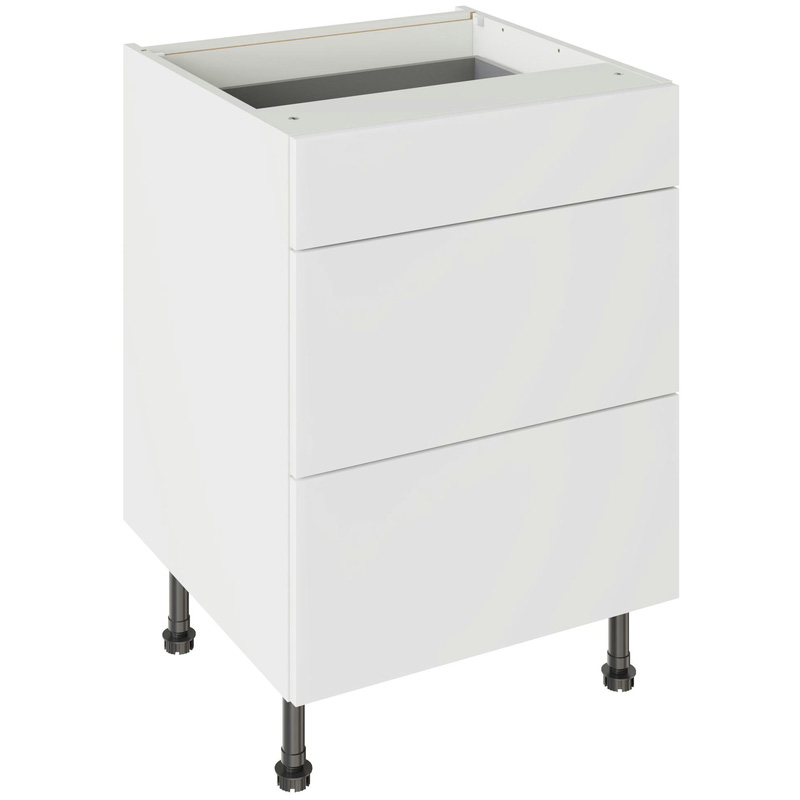 Assembling your kitchen cabinet has never been so easy. With this Kitchen Kit flatpack unit, you won't need to follow pages and pages of complicated instructions. Cabinets can be put together in lightning quick time with our cam and dowel quick-build design. The soft-close drawer runners ensure a smooth and silent action, adding a touch of luxury to your kitchen. Four adjustable legs make it easy to achieve maximum stability for base units, while a 49 mm service void allows you plenty of space for concealing pipes or wiring. Personalise your kitchen by choosing from a wide range of colours, sizes, and door styles. Whether you prefer the handleless J-Pull, the classic Shaker, or the modern Slab design, you can create a look you’ll love. * Delivered flat-packed with cabinet, door and hinges included * Cam and Dowel Quick-build design * Simply glue and click together to form a strong fixing - fast! * Soft Close Hafele drawer boxes. * Fully integrated soft-close hinges - no more doors slamming shut * 150 mm adjustable legs to ensure maximum stability * 49 mm rear service void for concealing pipes, wiring and other essentials * 18 mm MFC cabinet with 8 mm back for rigidity * FIRA Gold certification on doors and cabinets * Door handles, plinths, panels and other accessories sold separately | Kitchen Kit Slab 3 Drawer Base Kitchen Cabinet Supergloss 600mm in White