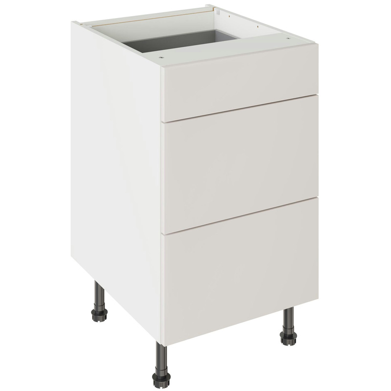 Assembling your kitchen cabinet has never been so easy. With this Kitchen Kit flatpack unit, you won't need to follow pages and pages of complicated instructions. Cabinets can be put together in lightning quick time with our cam and dowel quick-build design. The soft-close drawer runners ensure a smooth and silent action, adding a touch of luxury to your kitchen. Four adjustable legs make it easy to achieve maximum stability for base units, while a 49 mm service void allows you plenty of space for concealing pipes or wiring. Personalise your kitchen by choosing from a wide range of colours, sizes, and door styles. Whether you prefer the handleless J-Pull, the classic Shaker, or the modern Slab design, you can create a look you’ll love. * Delivered flat-packed with cabinet, door and hinges included * Cam and Dowel Quick-build design * Simply glue and click together to form a strong fixing - fast! * Soft Close Hafele drawer boxes. * Fully integrated soft-close hinges - no more doors slamming shut * 150 mm adjustable legs to ensure maximum stability * 49 mm rear service void for concealing pipes, wiring and other essentials * 18 mm MFC cabinet with 8 mm back for rigidity * FIRA Gold certification on doors and cabinets * Door handles, plinths, panels and other accessories sold separately | Kitchen Kit Slab 3 Drawer Base Kitchen Cabinet Supermatt 500mm in Light Grey