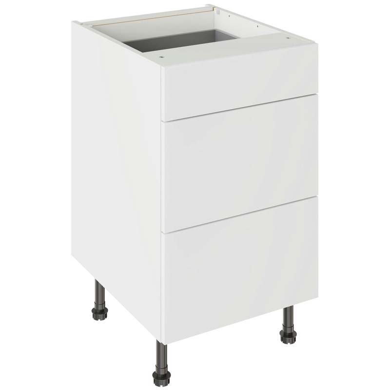 Assembling your kitchen cabinet has never been so easy. With this Kitchen Kit flatpack unit, you won't need to follow pages and pages of complicated instructions. Cabinets can be put together in lightning quick time with our cam and dowel quick-build design. The soft-close drawer runners ensure a smooth and silent action, adding a touch of luxury to your kitchen. Four adjustable legs make it easy to achieve maximum stability for base units, while a 49 mm service void allows you plenty of space for concealing pipes or wiring. Personalise your kitchen by choosing from a wide range of colours, sizes, and door styles. Whether you prefer the handleless J-Pull, the classic Shaker, or the modern Slab design, you can create a look you’ll love. * Delivered flat-packed with cabinet, door and hinges included * Cam and Dowel Quick-build design * Simply glue and click together to form a strong fixing - fast! * Soft Close Hafele drawer boxes. * Fully integrated soft-close hinges - no more doors slamming shut * 150 mm adjustable legs to ensure maximum stability * 49 mm rear service void for concealing pipes, wiring and other essentials * 18 mm MFC cabinet with 8 mm back for rigidity * FIRA Gold certification on doors and cabinets * Door handles, plinths, panels and other accessories sold separately | Kitchen Kit Slab 3 Drawer Base Kitchen Cabinet Supermatt 500mm in White