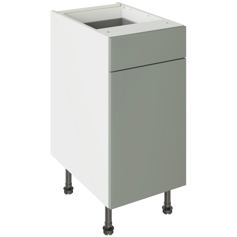 Assembling your kitchen cabinet has never been so easy. With this Kitchen Kit flatpack unit, you won't need to follow pages and pages of complicated instructions. Cabinets can be put together in lightning quick time with our cam and dowel quick-build design. The soft-close drawer runners ensure a smooth and silent action, adding a touch of luxury to your kitchen. Four adjustable legs make it easy to achieve maximum stability for base units, while a 49 mm service void allows you plenty of space for concealing pipes or wiring. Personalise your kitchen by choosing from a wide range of colours, sizes, and door styles. Whether you prefer the handleless J-Pull, the classic Shaker, or the modern Slab design, you can create a look you’ll love. * Delivered flat-packed with cabinet, door and hinges included * Cam and Dowel Quick-build design * Simply glue and click together to form a strong fixing - fast! * Soft Close Hafele drawer boxes. * Fully integrated soft-close hinges - no more doors slamming shut * 150 mm adjustable legs to ensure maximum stability * 49 mm rear service void for concealing pipes, wiring and other essentials * 18 mm MFC cabinet with 8 mm back for rigidity * FIRA Gold certification on doors and cabinets * Door handles, plinths, panels and other accessories sold separately | Kitchen Kit Slab Drawerline Base Cabinet Flatpack Supermatt 400mm in Agave Green
