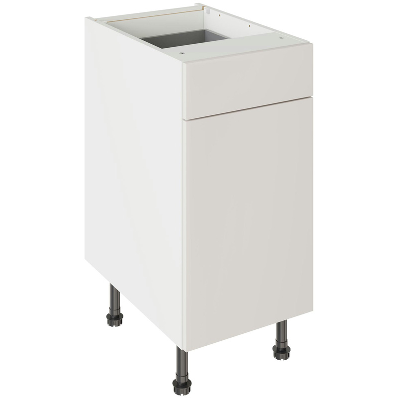 Assembling your kitchen cabinet has never been so easy. With this Kitchen Kit flatpack unit, you won't need to follow pages and pages of complicated instructions. Cabinets can be put together in lightning quick time with our cam and dowel quick-build design. The soft-close drawer runners ensure a smooth and silent action, adding a touch of luxury to your kitchen. Four adjustable legs make it easy to achieve maximum stability for base units, while a 49 mm service void allows you plenty of space for concealing pipes or wiring. Personalise your kitchen by choosing from a wide range of colours, sizes, and door styles. Whether you prefer the handleless J-Pull, the classic Shaker, or the modern Slab design, you can create a look you’ll love. * Delivered flat-packed with cabinet, door and hinges included * Cam and Dowel Quick-build design * Simply glue and click together to form a strong fixing - fast! * Soft Close Hafele drawer boxes. * Fully integrated soft-close hinges - no more doors slamming shut * 150 mm adjustable legs to ensure maximum stability * 49 mm rear service void for concealing pipes, wiring and other essentials * 18 mm MFC cabinet with 8 mm back for rigidity * FIRA Gold certification on doors and cabinets * Door handles, plinths, panels and other accessories sold separately | Kitchen Kit Slab Drawerline Base Cabinet Flatpack Supermatt 400mm in Light Grey