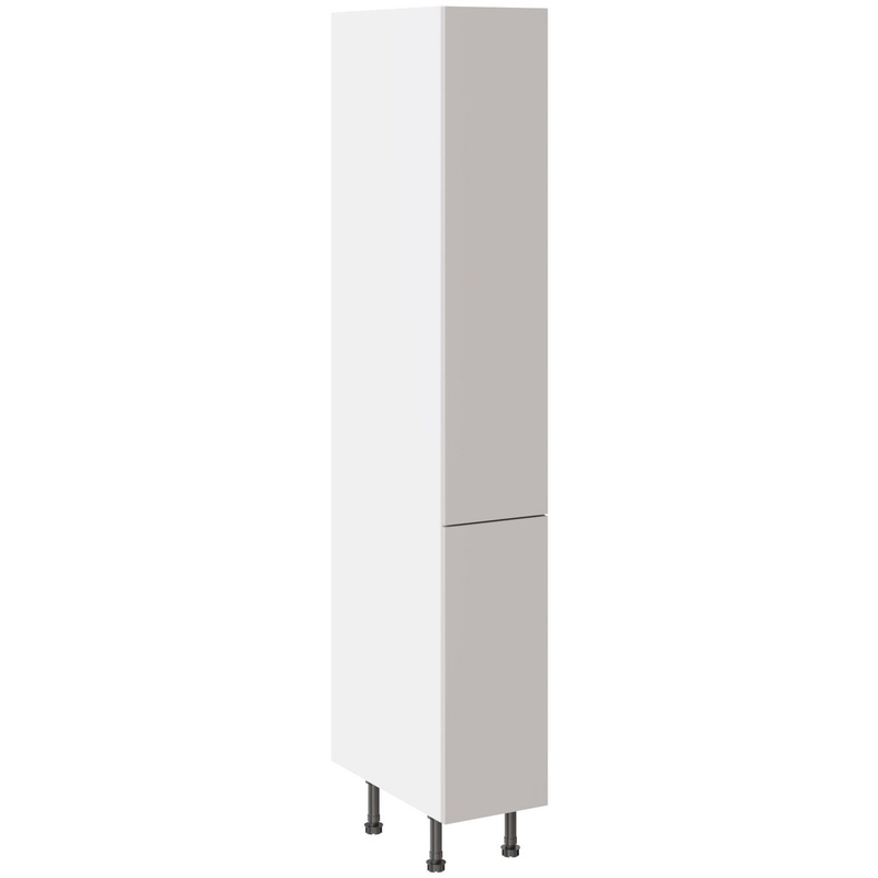 Assembling your kitchen cabinet has never been so easy. With this Kitchen Kit flatpack unit, you won't need to follow pages and pages of complicated instructions. Cabinets can be put together in lightning quick time with our cam and dowel quick-build design. Doors can be hinged on the left or right side of this kitchen unit to best suit your layout, with a soft-close function that ensures they'll never slam shut loudly again. Four adjustable legs make it easy to achieve maximum stability for base units, while a 49 mm service void allows you plenty of space for concealing pipes or wiring. Personalise your kitchen by choosing from a wide range of colours, sizes, and door styles. Whether you prefer the handleless J-Pull, the classic Shaker, or the modern Slab design, you can create a look you’ll love. * Delivered flat-packed with cabinet, door and hinges included * Cam and Dowel Quick-build design * Simply glue and click together to form a strong fixing - fast! * Doors can be hinged on the left or right side to suit your configuration * Fully integrated soft-close hinges - no more doors slamming shut * 150 mm adjustable legs to ensure maximum stability * 49 mm rear service void for concealing pipes, wiring and other essentials * 18 mm MFC cabinet with 8 mm back for rigidity * 18mm Door drilled ready to hang * FIRA Gold certification on doors and cabinets * Door handles, plinths, panels and other accessories sold separately | Kitchen Kit Slab Pull & Swing Larder Cabinet Supermatt 300mm in Light Grey