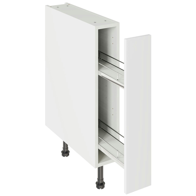 Assembling your kitchen cabinet has never been so easy. With this Kitchen Kit flatpack unit, you won't need to follow pages and pages of complicated instructions. Cabinets can be put together in lightning quick time with our cam and dowel quick-build design. Doors can be hinged on the left or right side of this kitchen unit to best suit your layout, with a soft-close function that ensures they'll never slam shut loudly again. Four adjustable legs make it easy to achieve maximum stability for base units, while a 49 mm service void allows you plenty of space for concealing pipes or wiring. Personalise your kitchen by choosing from a wide range of colours, sizes, and door styles. Whether you prefer the handleless J-Pull, the classic Shaker, or the modern Slab design, you can create a look you’ll love. * Delivered flat-packed with cabinet, door and hinges included * Cam and Dowel Quick-build design * Simply glue and click together to form a strong fixing - fast! * Doors can be hinged on the left or right side to suit your configuration * Fully integrated soft-close hinges - no more doors slamming shut * 150 mm adjustable legs to ensure maximum stability * 49 mm rear service void for concealing pipes, wiring and other essentials * 18 mm MFC cabinet with 8 mm back for rigidity * 18mm Door drilled ready to hang * FIRA Gold certification on doors and cabinets * Door handles, plinths, panels and other accessories sold separately | Kitchen Kit Slab Supergloss Base Kitchen Cabinet Pull-Out Flatpack 150mm in White