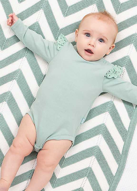 Gorgeous in soft spruce green! Kite's beautiful bodysuits are wonderfully soft and comfy, making them perfect for everyday. This long-sleeved baby vest, with its pretty broderie detail on the shoulders, looks great worn as a top with countless outfits. Ideal for naptimes too, and the handy shoulder popper opening makes change time easy peasy.Machine washable at 40 degrees, or at 30 degrees to be kinder to the planet95% cotton, 5% Elastane