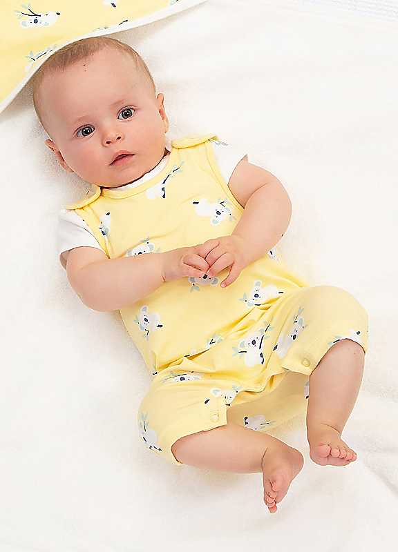 The perfect two-piece outfit for the season, featuring a cream bodysuit with envelope neck and koala face placement print on the sleeve and Koala Time short dungarees with popper fastenings. You'll love how this set is adaptable to suit your little one - both parts can be mixed and matched with other styles or worn together. It's a great option for those looking for comfort and cosiness.Machine washable at 40 degrees, or at 30 degrees to be kinder to the planet95% cotton, 5% Elastane