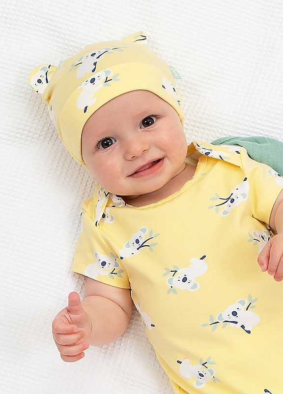 Keep your little one snug and cosy with this perfect cotton hat. Featuring a sweet Koala Time print with a turn-up and cute ears.Machine washable at 40 degrees, or at 30 degrees to be kinder to the planet95% cotton, 5% Elastane | animal print hat, washable hat, soft hat, animal ear hat, infant beanie hat