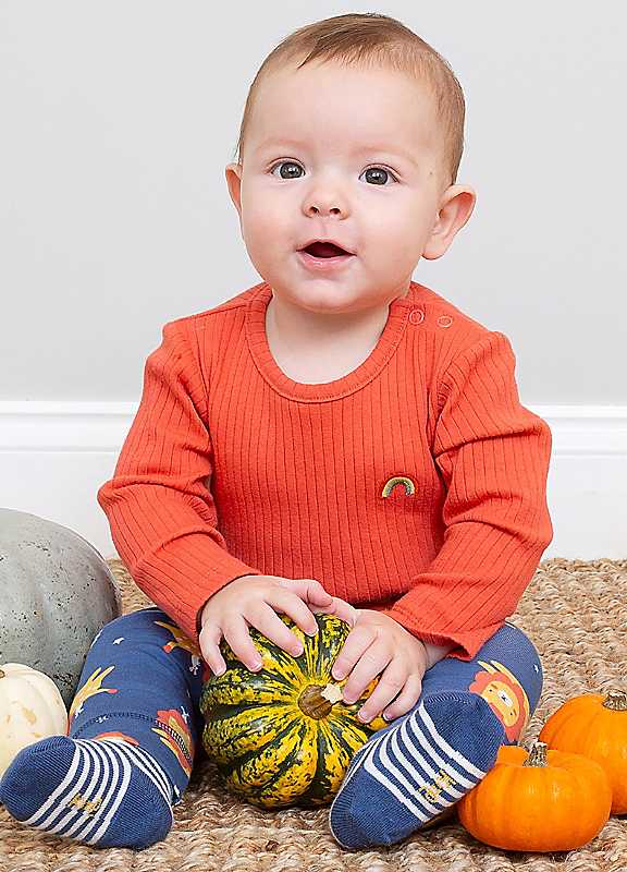 Kite's beautiful bodysuits are wonderfully soft and comfy, making them perfect for every day. This long-sleeved ribbed baby vest with a fun little rainbow embroidery looks great worn as a t-shirt or with leggings. The handy shoulder popper opening makes change time easy peasy too.Proud to be certified to the Global Organic Textile Standard (GOTS). GOTS is the leading organic textile standard and companies must meet strict environmental and social criteria to become certified. All the elements in Kite's supply chain - ranging from the cotton growers to the embroiderers - have been successfully inspected to ensure they meet comprehensive organic and socially responsible standards.Little rainbow embroideryBurnt orange8x3 rib (220-230 gsm)Popper crotch & shoulder openingLong sleevedRound neckMade in TurkeyMachine washable at 40°C, or at 30°C to be kinder to the planet95% Organic Cotton, 5% Elastane