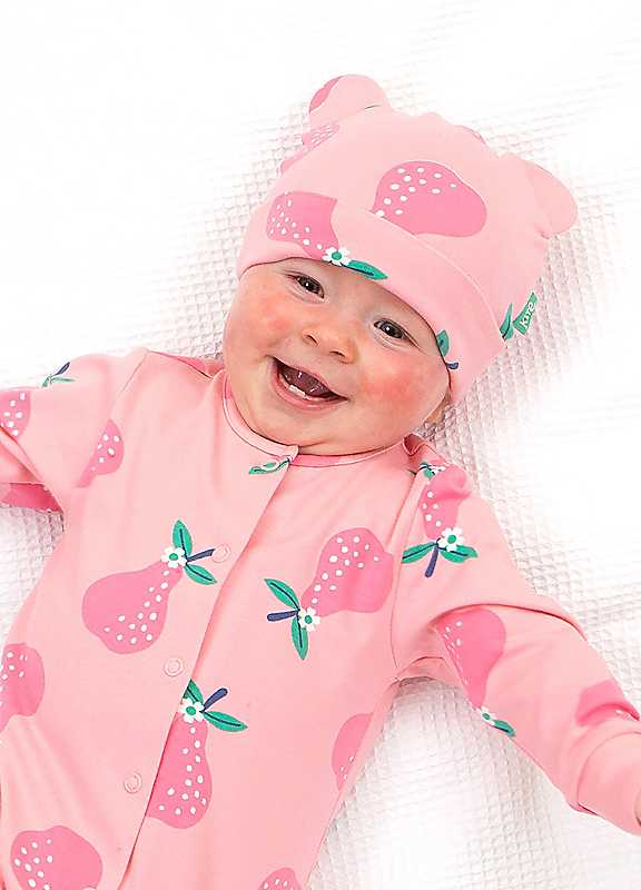Keep your little one snug and cosy with this perfect cotton hat. Featuring a gorgeous Pear-fect print with a turn-up and cute ears.Machine washable at 40 degrees, or at 30 degrees to be kinder to the planet95% cotton, 5% Elastane