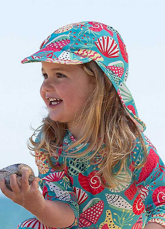 What's the best thing about the beach? The shells of course! Inspired by fond memories of days spent collecting seashells, and the joy of finding a special one, this kepi/legionnaire style beach hat is a must-have accessory for long days on the beach or out in the garden. Both pretty and practical, with neck coverage and upf 50+ protection, it is an ideal option for keeping little faces and necks safe from the sun. Hand wash in cold water 80% Recycled Nylon 20% Elastane
