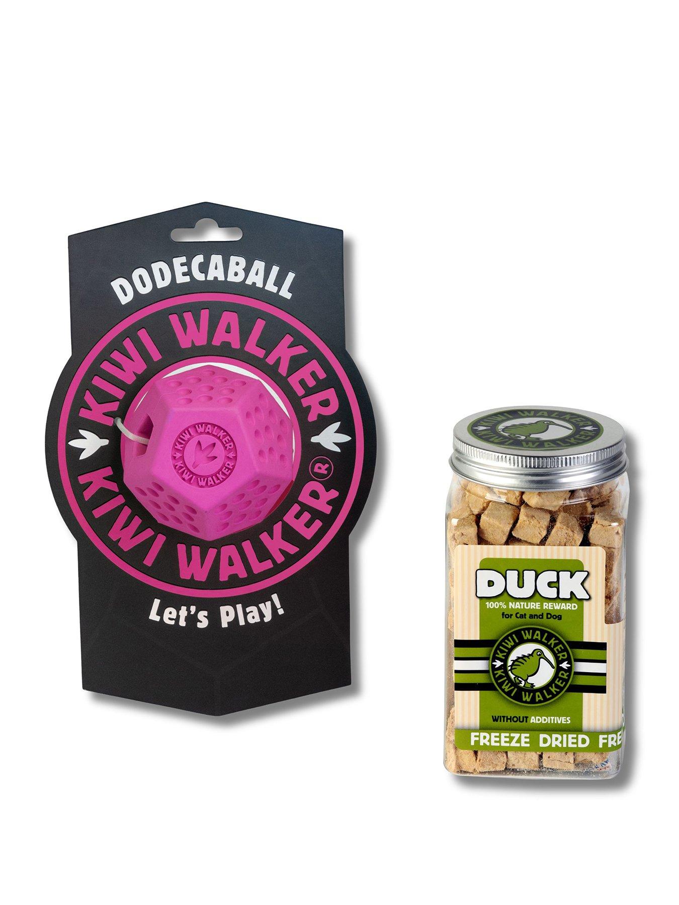 Kiwi Walker Twin Set - Rubber Dodecaball And Treats (Duck) Great Little Bundle For Treat-Time And Enrichment. Includes A Kiwi Walker Dodecaball Treat-Dispensing Dog Toy In Pink (Treats Can Be Placed Inside For Rolling/Foraging Fun) Plus A Jar Of Kiwi Walker Freeze Dried Duck Dog Treats. Depth: 13 Cm Height: 13 Cm Width: 7 Cm