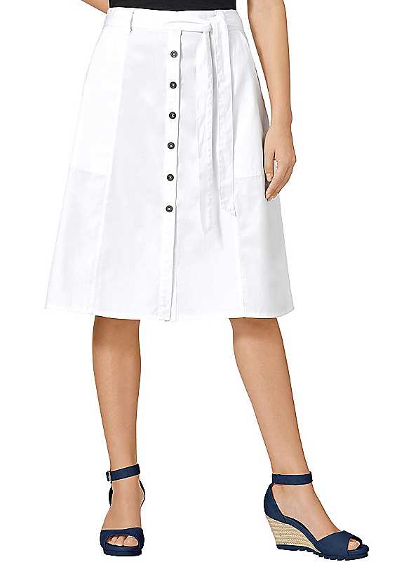 Versatile skirt in an A-line design finished with a flattering button-up panel on the front. Also features belt loops, a belt, two side pockets and a practical front vent. Button fastening Belt detail Washable 100% Cotton Petite length approx. 56 cm (22 in) Regular length approx. 60 cm (24 in)