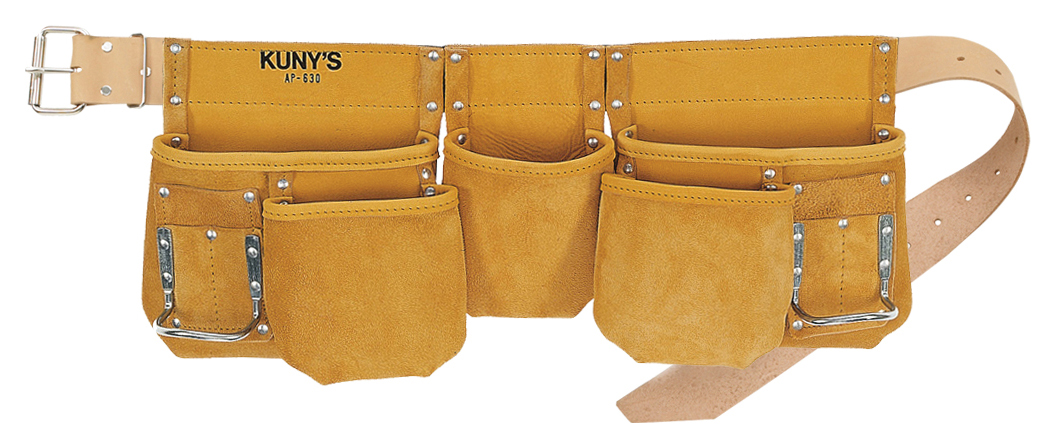 Kuny's AP-630 Carpenter's Full Grain Leather Apron - Built to handle the demands of the job site, the Kuny’s Journeyman Carpenter’s Apron is crafted from heavy-duty leather with reinforced stress points for long-lasting durability. Designed with functionality in mind, it features a sturdy leather belt with a roller buckle for a secure and adjustable fit. The apron includes five reversed nail pockets (2 large, 3 small) for easy access to your tools and fasteners, plus a deep center pocket ideal for a tape measure or other essentials. Two heavy steel hammer holders and additional pockets for pencils, markers, and small tools keep everything you need within reach.