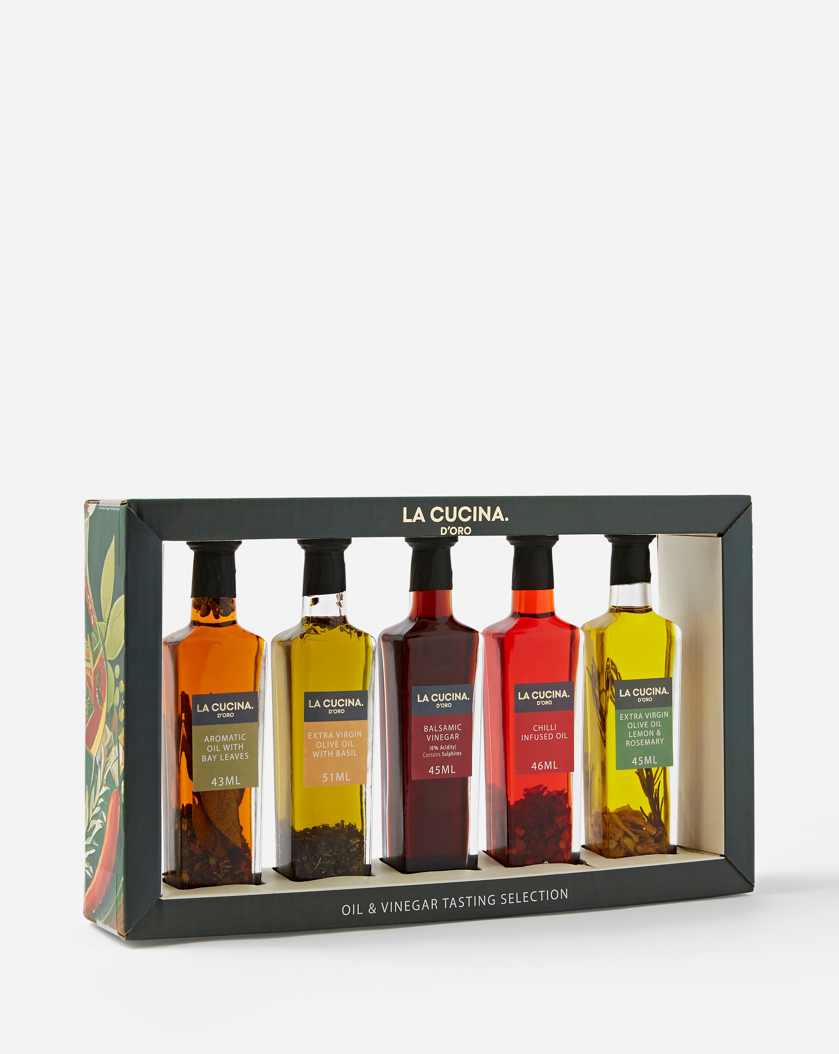 Give the gift of gourmet with this La Cucina Tasting Selection - an oil and vinegar set designed to elevate every dish. With five infused bottles including chilli, lemon, rosemary, basil and classic balsamic, it's ideal for experimenting in the kitchen or enhancing everyday meals. Beautifully boxed and full of flavour, it's one of the best Christmas gifts for cooks and a top choice for refined foodie presents. Sunflower Oil Infused with Peppercorns, Chilli, Basil and Bay Leaves 43ml. Olive Oil Infused with Basil 51ml. Italian Balsamic Vinegar 45ml. Sunflower Oil Infused with Chilli Flakes 46ml. Olive Oil Infused with Lemon and Rosemary 45m. Please note we are unable to deliver this item ROI or Northern Ireland.