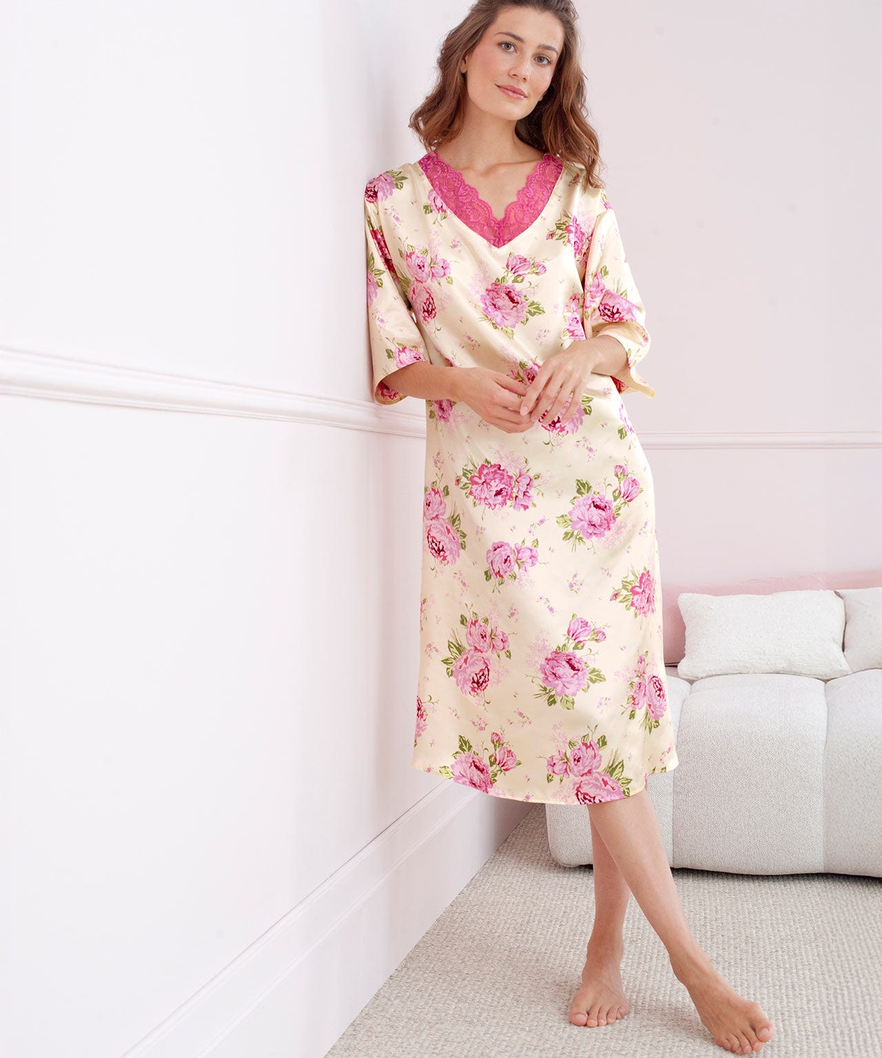 Smooth and soft, our satin nightdress with a pretty lace trim neckline has a touch of stretchy for comfort all night long. With wearable 3/4 sleeves, and made from an easy care wash and wear fabric. 100% Polyester. Length: 112cm (44") approx.