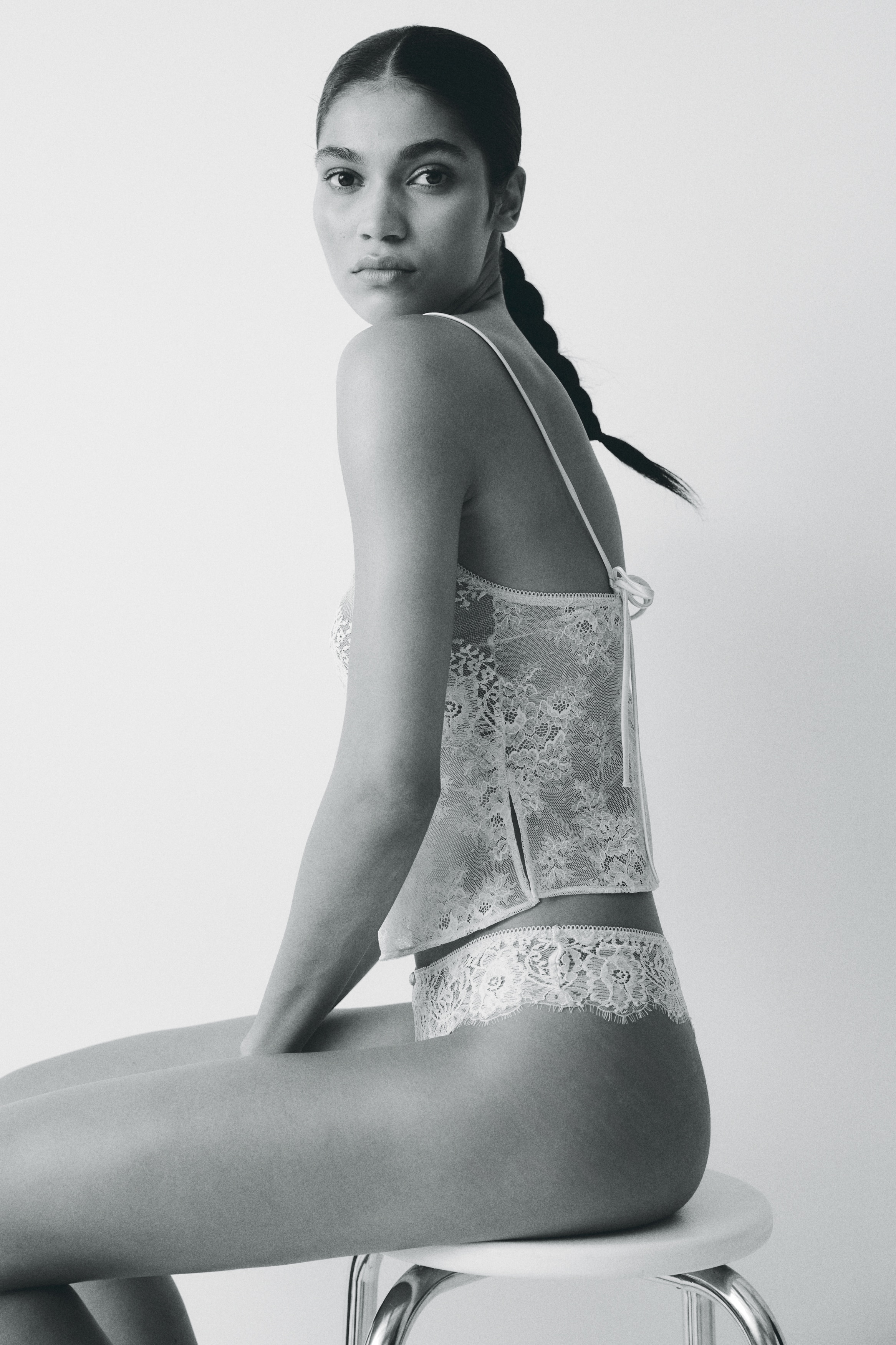 Thong briefs in lace with a low, V-shaped waist and a lined gusset.