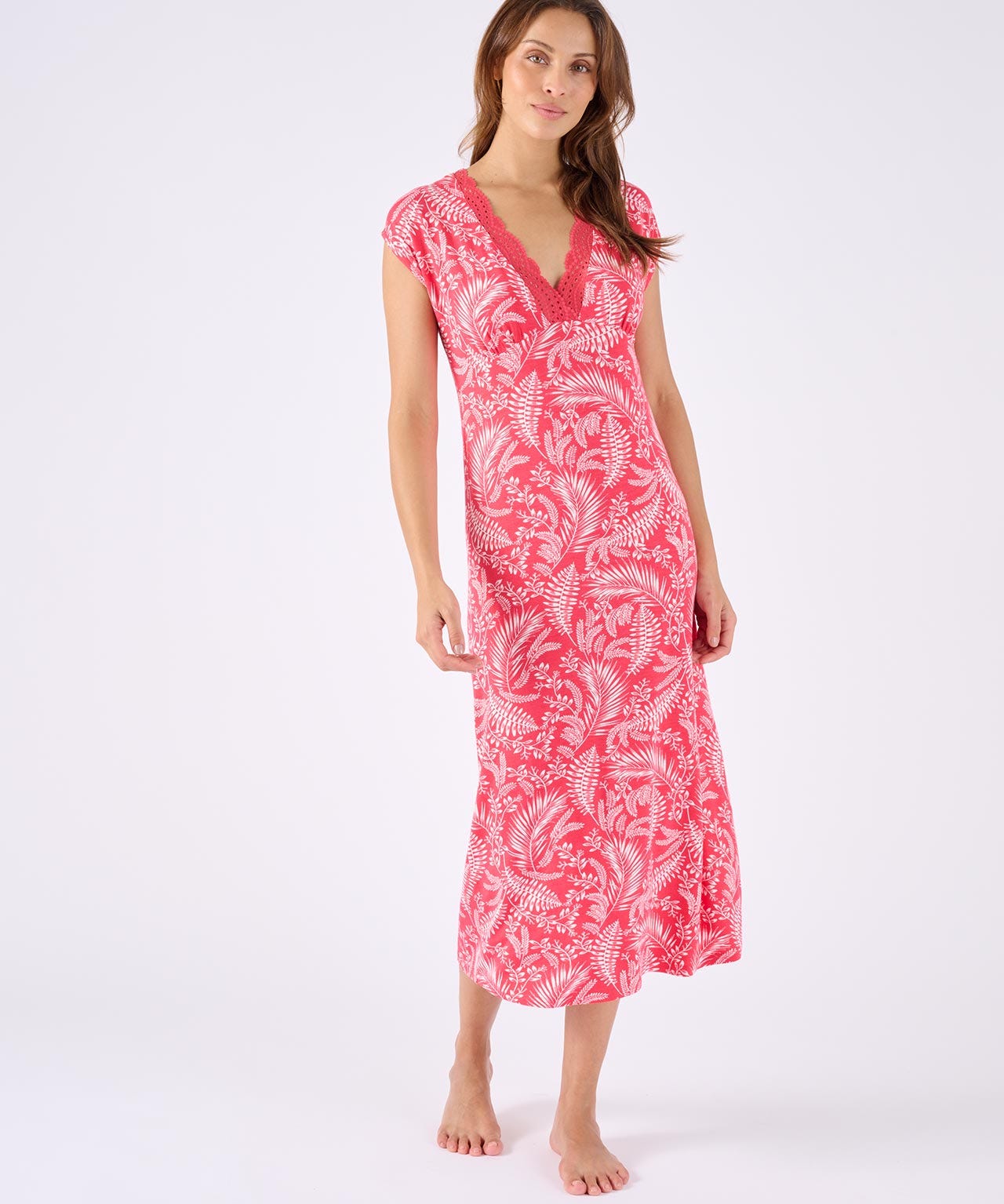 Update your nightwear collection with our contemporary leaf print nightdress. In a fabulously soft Modal blend with stretch for comfort. Finished with lace at the flattering V neck and gathering detail at the bust. 95% Modal, 5% Elastane. Length: 117cm (46") approx.