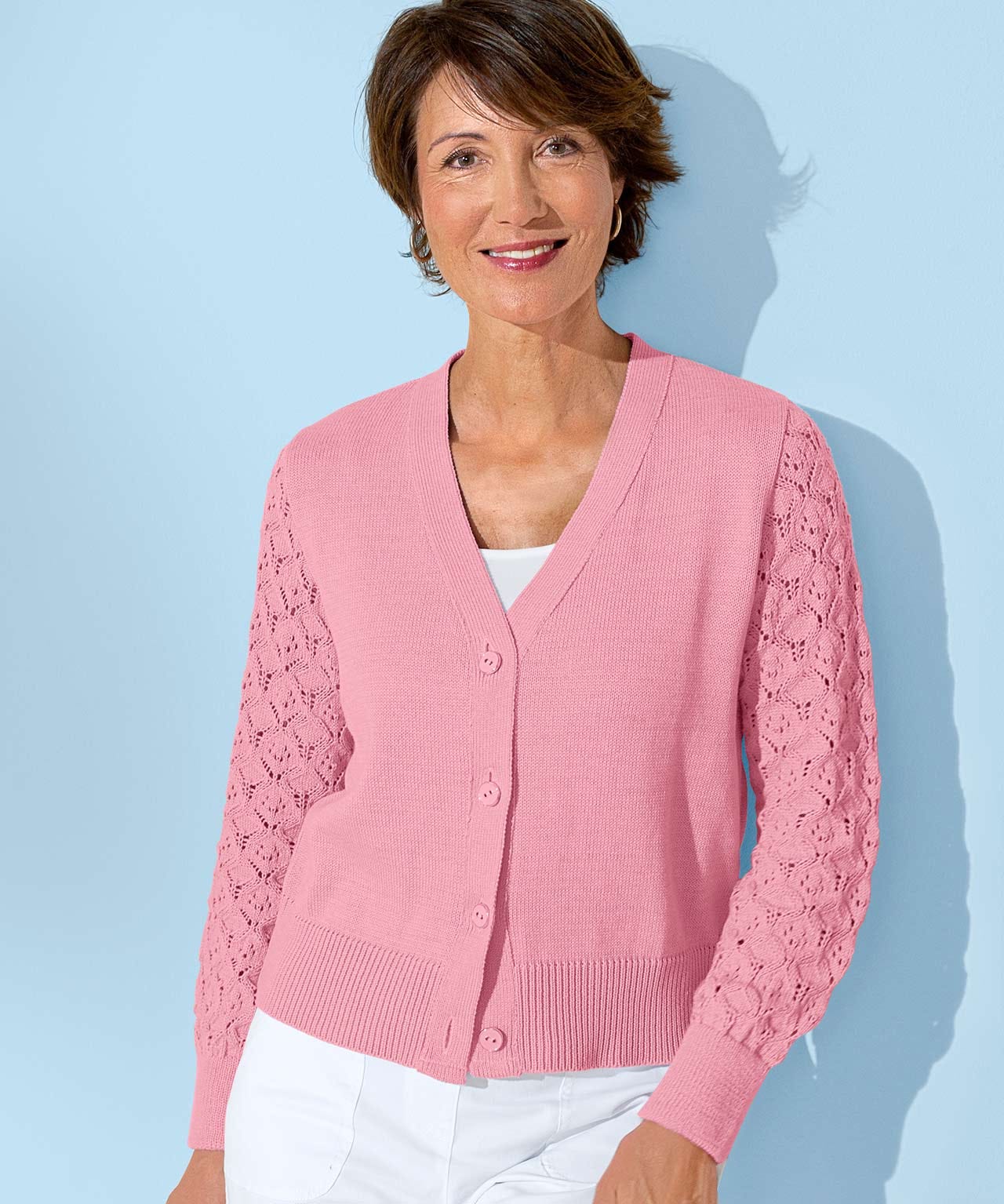 The cardigan your wardrobe is waiting for - made from a soft cotton blend and featuring pretty pointelle sleeves for contrast. With a flattering V neck so you can layer it easily, with deep rib trims for a modern look. Regular fit. 50% Cotton, 50% Acrylic. Length: 55cm (22") approx.