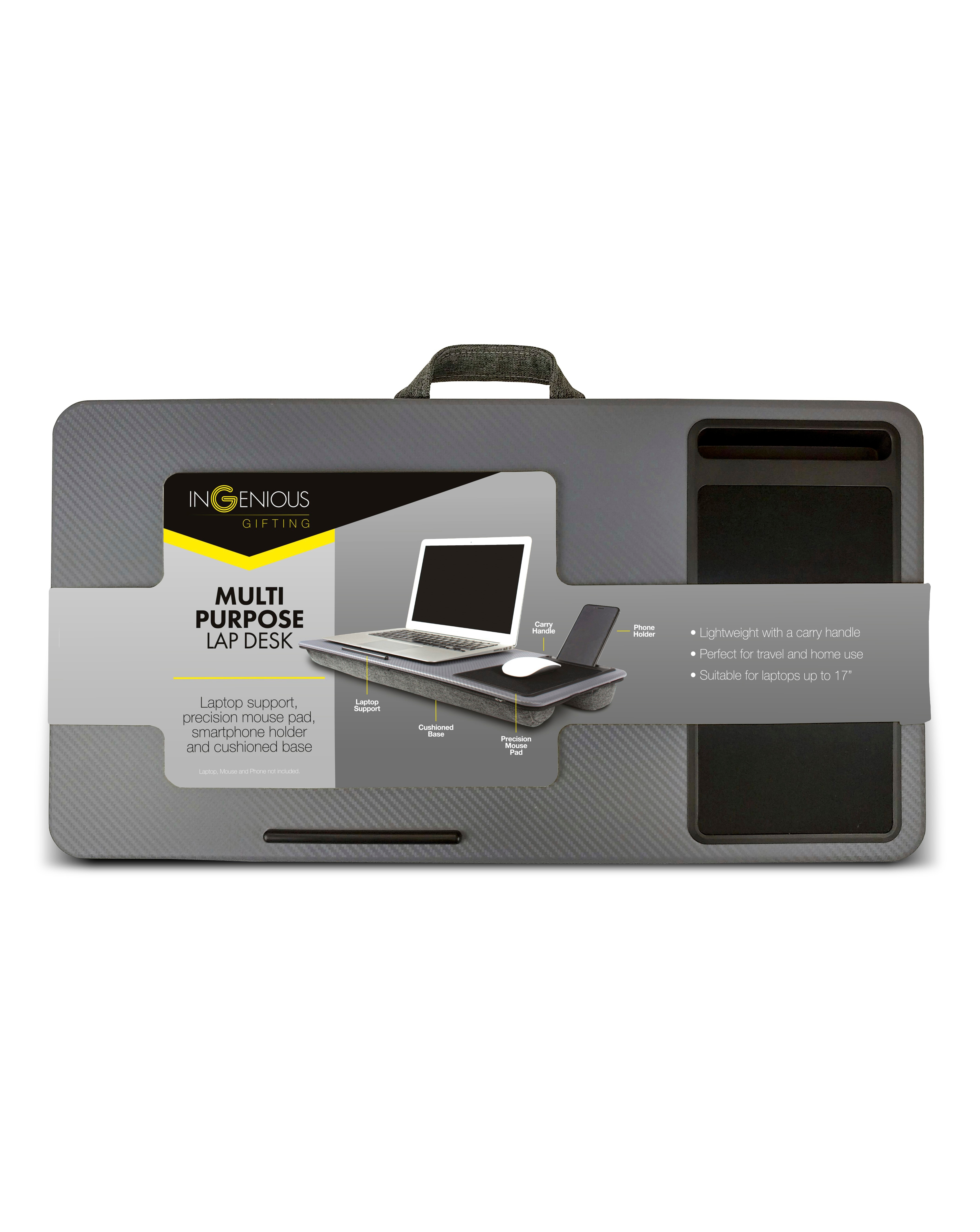 This is a portable desk that lets you use your laptop with ease, without having to juggle your phone and use the sofa cushion as a mouse mat. Includes a built-in mouse pad and slot for your mobile phone.