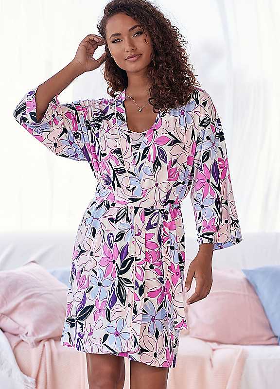 Elevate your nightwear game with our Floral Three-Quarter Sleeve Kimono Dressing Gown. This short length gown features a beautiful all-over floral print, three quarter length sleeves, and a tie belt with a kimono collar. Made from a pleasant viscose blend, it is perfect for mix & match nightwear.50% Cotton, 45% Viscose, 5% ElastaneKeep away from fire. | pastel robes, black floral kimono robe, floral kimono robe, womens floral dressing gown, kimono style dressing gown, wrap around robe, blue floral kimono, cotton kimono dressing gown, wrap robe womens, short cotton kimono, robes viscose, cotton kimono