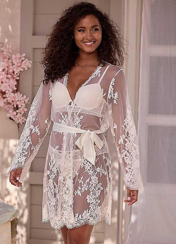 Seductive and subtly transparent, the LASCANA Lace Kimono is made entirely of dreamy eyelash lace, with a satin-look belt to tie around your waist and enhance your curves. This versatile piece can be worn over lingerie for a sexy night in or paired with a slip dress for a romantic date night. Elevate your wardrobe with this elegant and alluring kimono.89% Polyamide, 10% Polyester, 1% Elastane